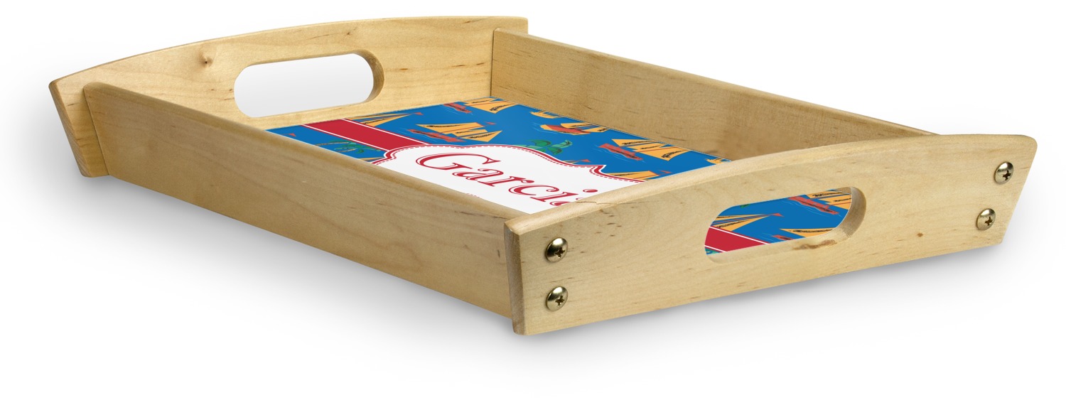 This serving tray with handles features square edges and two rounded sides, creating a very modern look. Each side is fabricated from a beautifully cut, natural wood. The bottom of the interior of the tray displays your customized design in bright, vibrant color. The tray is sold in both a black color and a natural wood look. Each variation of the wood serving tray has two sizes: Small, which is 14" x 10" x 2.25", and Large, which is 19.5" x 13.5" x 2.75".