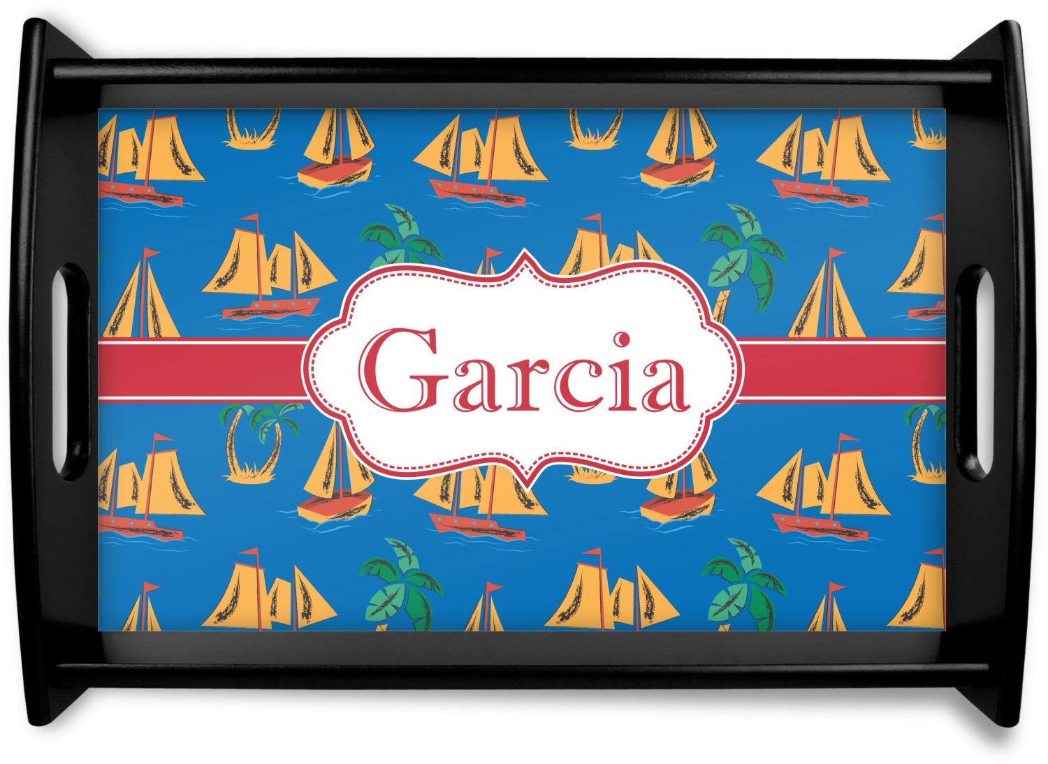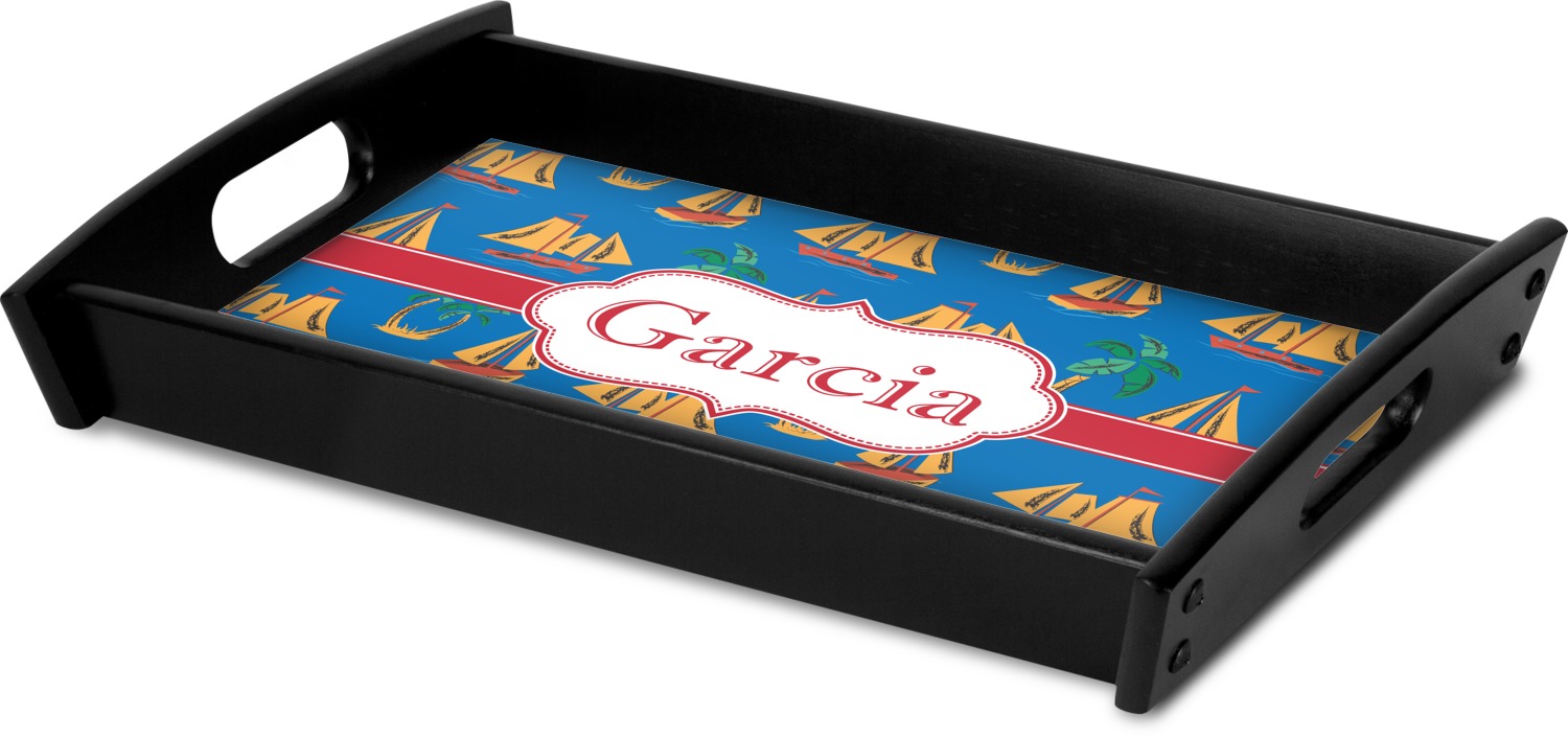 This serving tray with handles features square edges and two rounded sides, creating a very modern look. Each side is fabricated from a beautifully cut, natural wood. The bottom of the interior of the tray displays your customized design in bright, vibrant color. The tray is sold in both a black color and a natural wood look. Each variation of the wood serving tray has two sizes: Small, which is 14" x 10" x 2.25", and Large, which is 19.5" x 13.5" x 2.75".