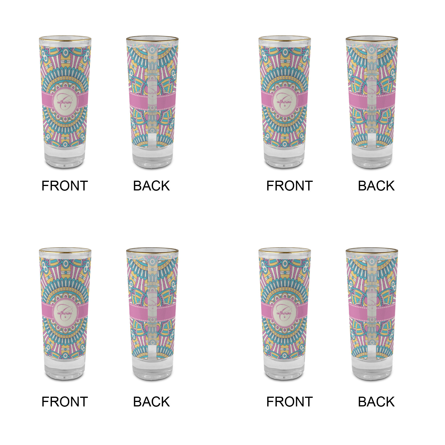 These glass shooter glasses are printed in full color with the design of your choice. These are a tall shooter 2 oz size and stand 4" tall. The print is a full wrap design to boldly display your personalization.