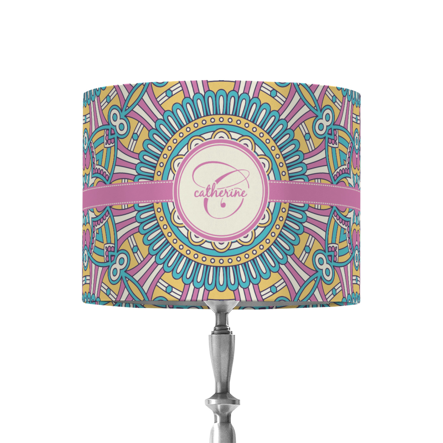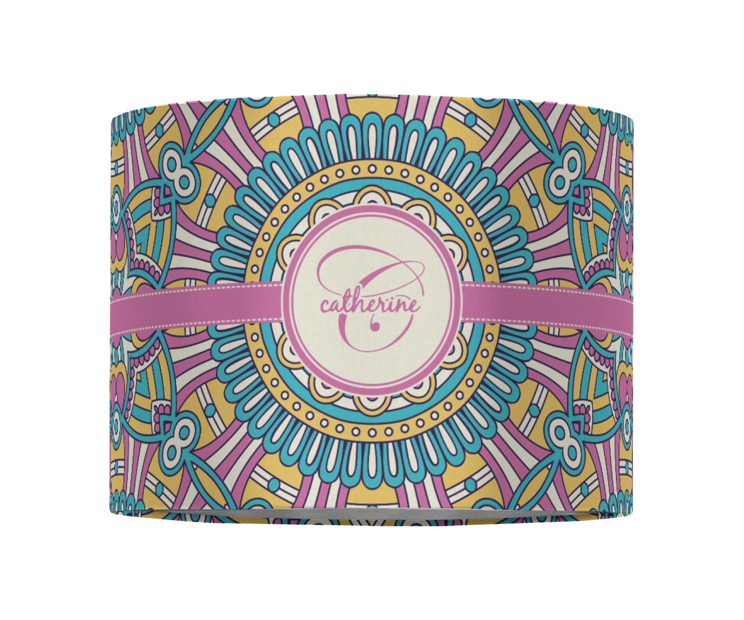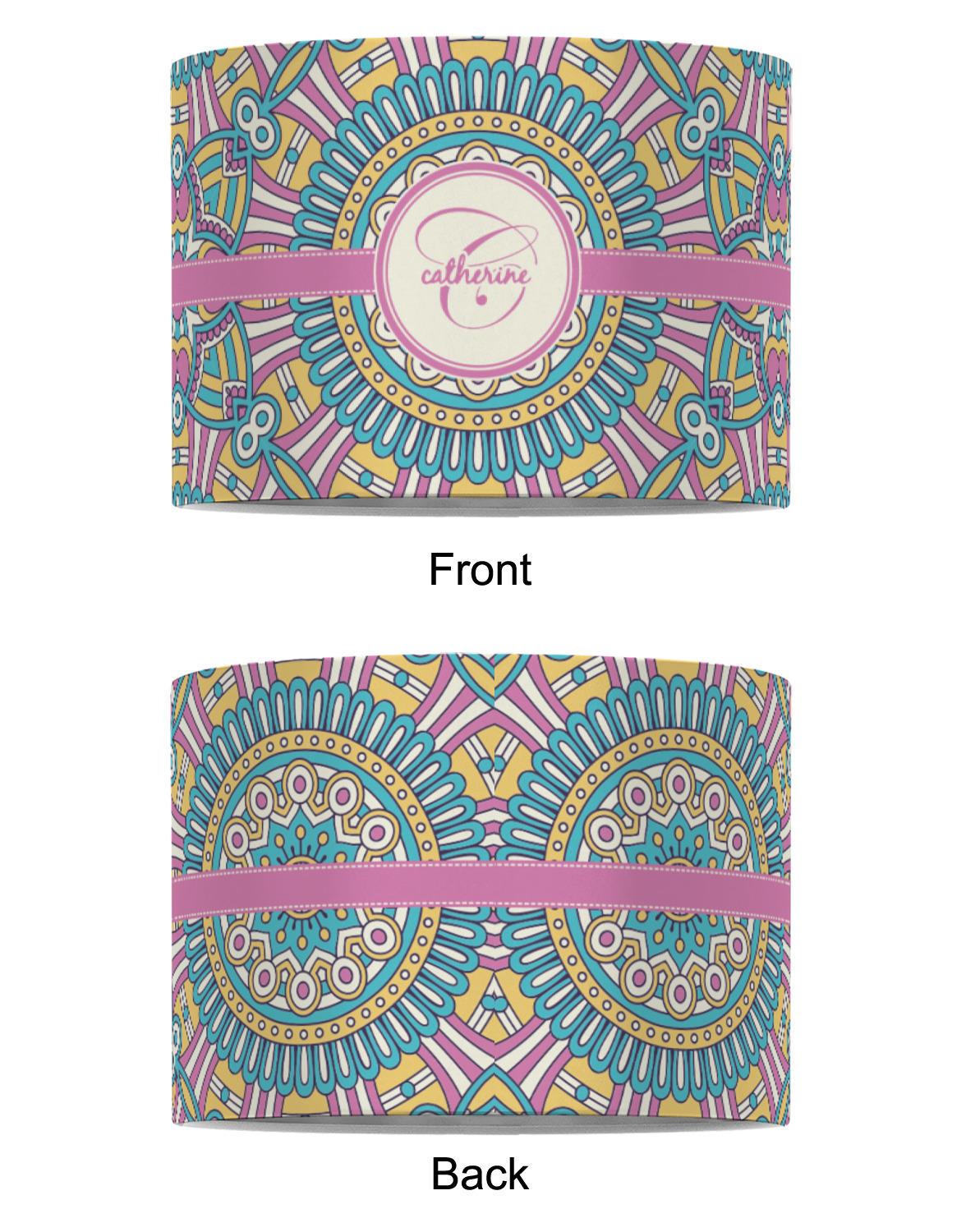 The designs main feature is its beautiful pattern. The pattern is filled with intricate detail and bohemian style shapes. The colors are a drastic difference from what you would normally see in a bohemian design, making this design all the more unique. You are able to put your personalization in the frame in the middle. The colors you will find are a bubble gum pink, teal, light yellow, and white.