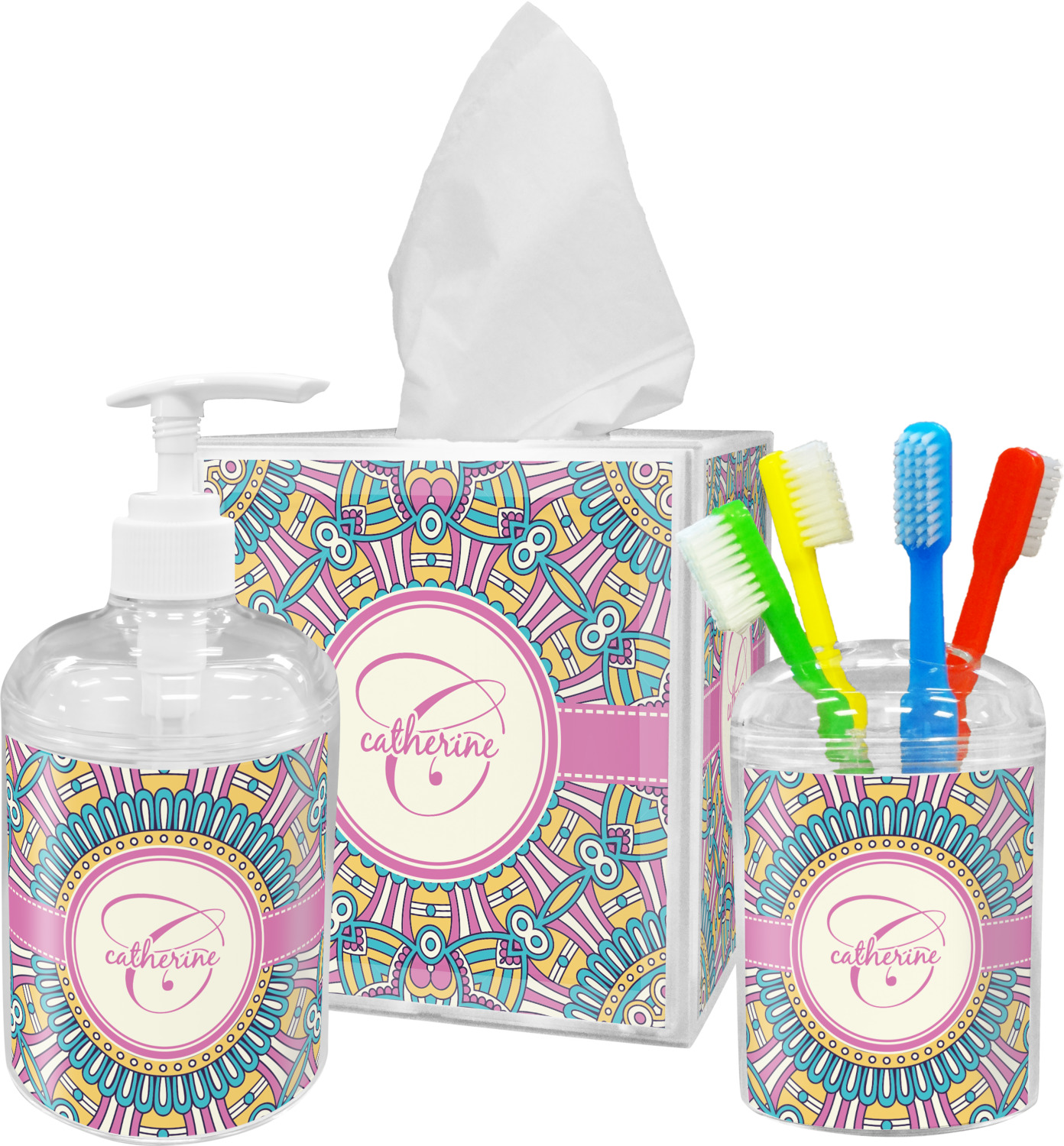 With our bathroom accessories set, decorating your bathroom with coordinating pieces is effortless! Customize this bathroom set to match your bathroom's current theme, or design it with bold patterns and colors to serve as an accent piece for your guests to marvel at! These even make for wonderful housewarming gifts, as they are beautiful and functional at the same time!