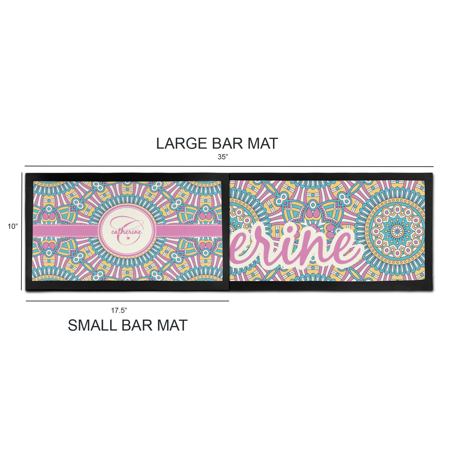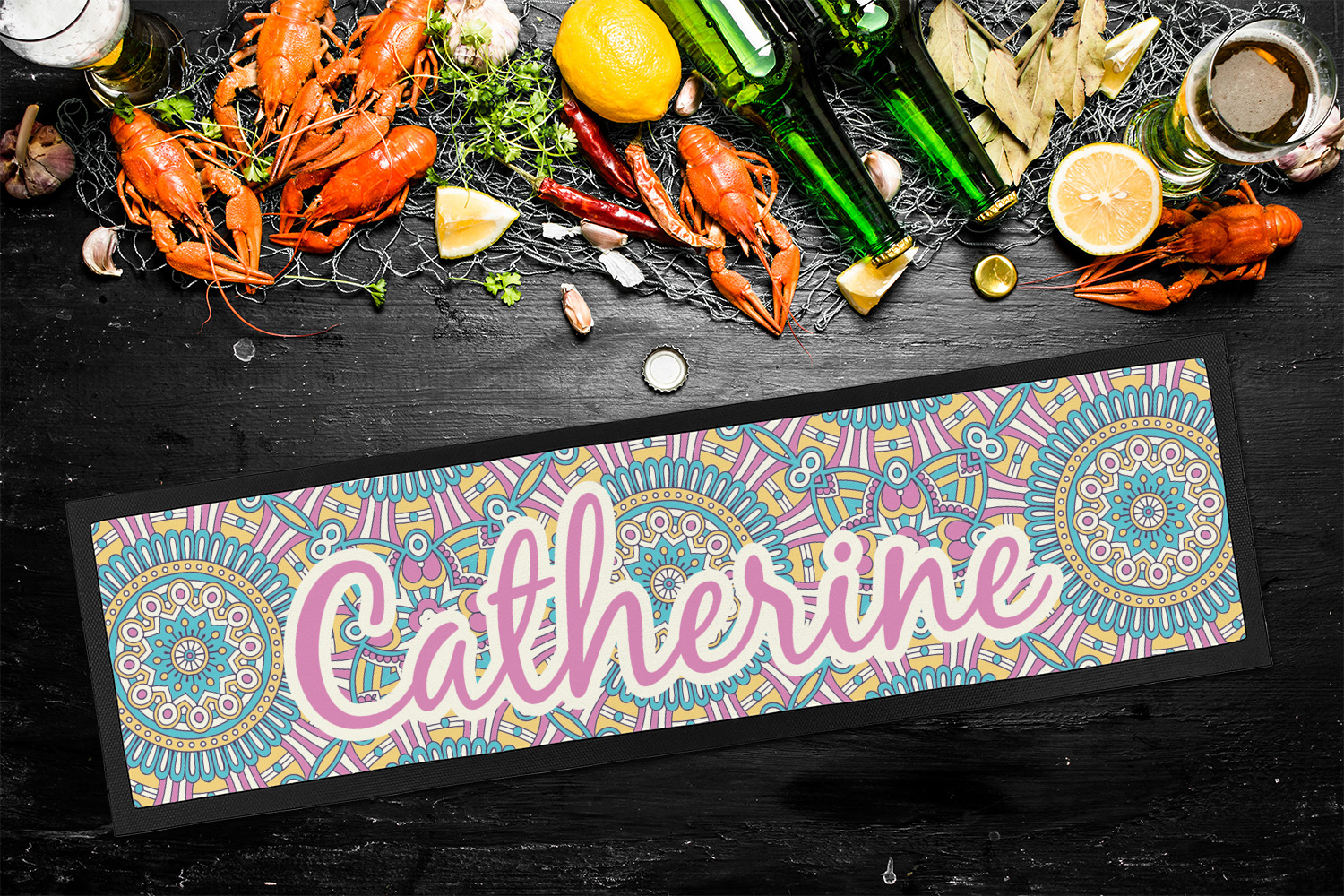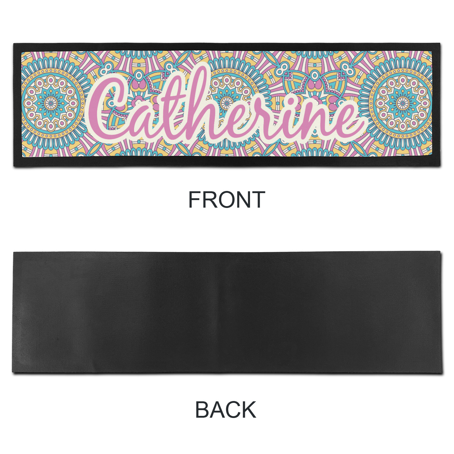 The designs main feature is its beautiful pattern. The pattern is filled with intricate detail and bohemian style shapes. The colors are a drastic difference from what you would normally see in a bohemian design, making this design all the more unique. You are able to put your personalization in the frame in the middle. The colors you will find are a bubble gum pink, teal, light yellow, and white.