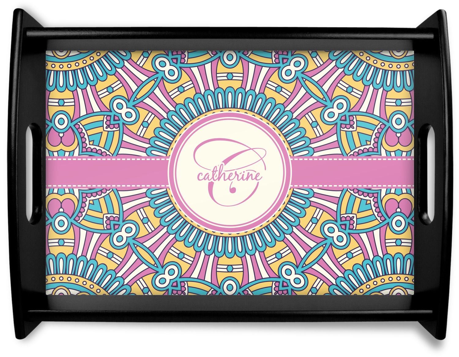 The designs main feature is its beautiful pattern. The pattern is filled with intricate detail and bohemian style shapes. The colors are a drastic difference from what you would normally see in a bohemian design, making this design all the more unique. You are able to put your personalization in the frame in the middle. The colors you will find are a bubble gum pink, teal, light yellow, and white.