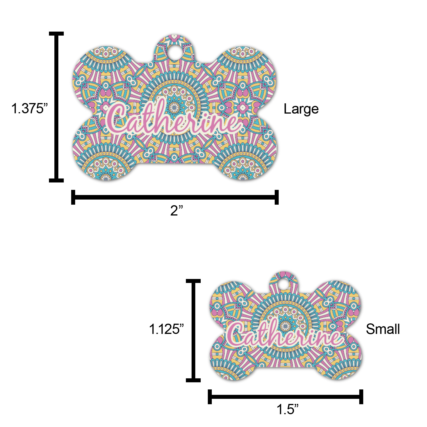 The small bone dog tag size is perfect to pair with our small dog collars, the large size pairs well with our large dog collars.