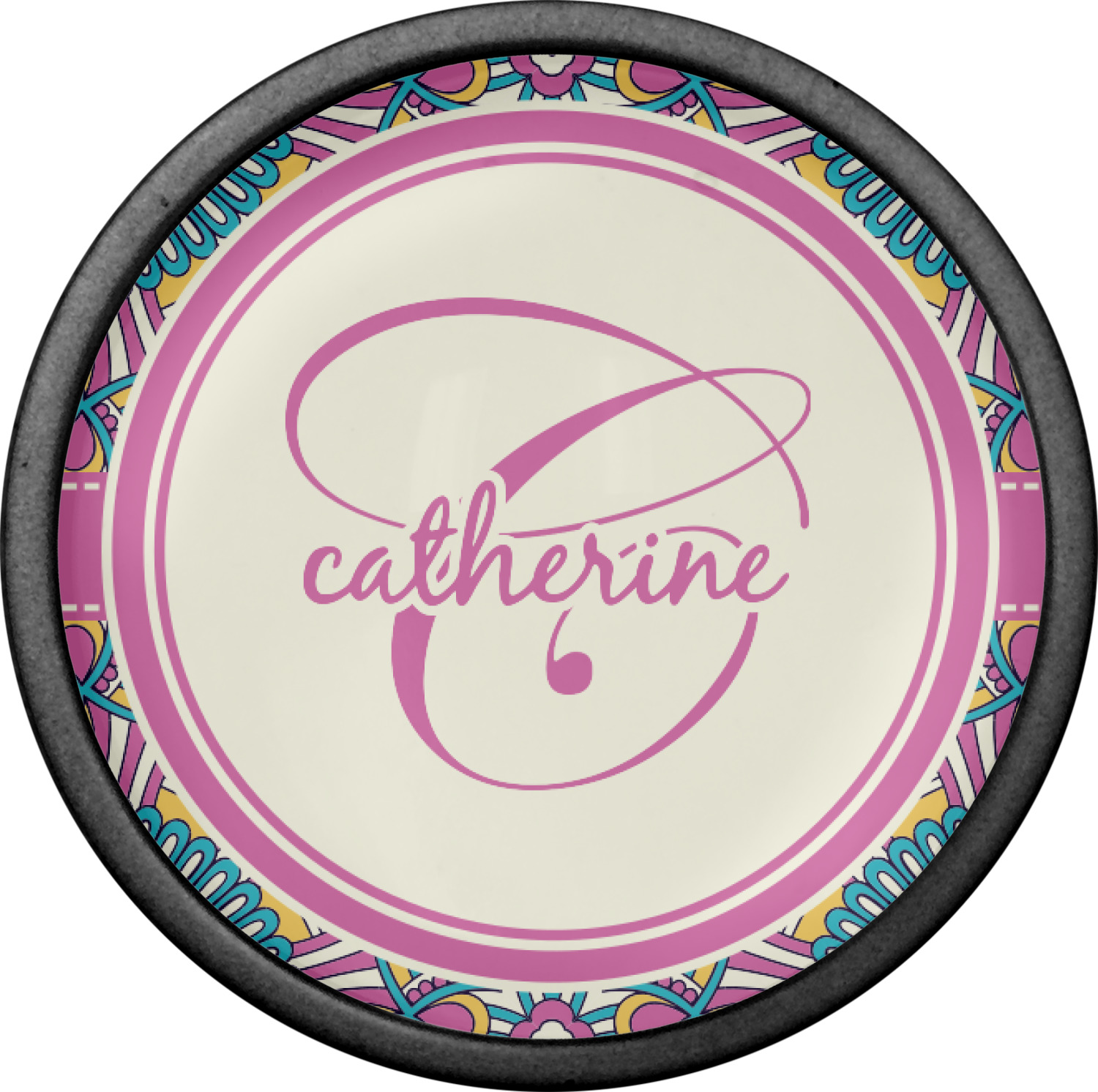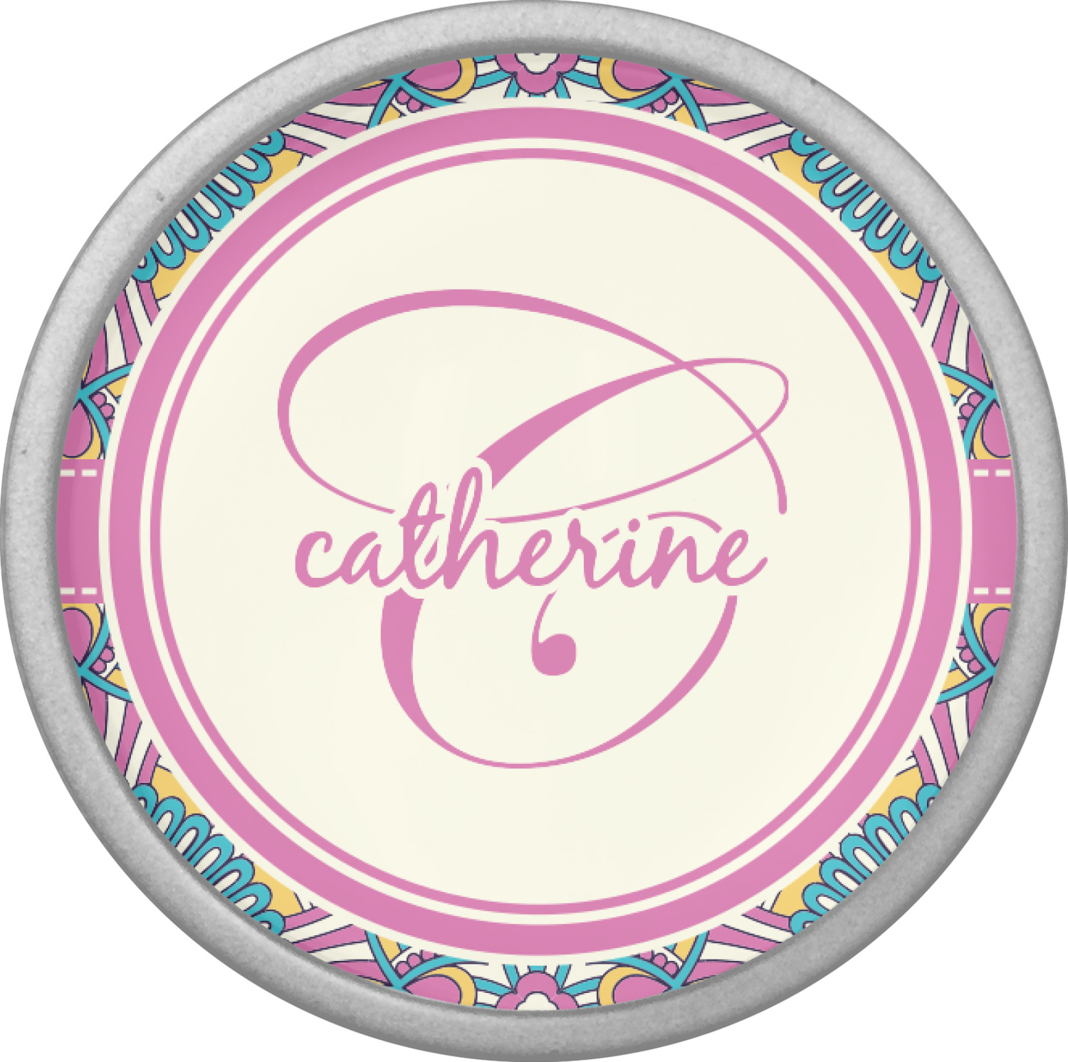The designs main feature is its beautiful pattern. The pattern is filled with intricate detail and bohemian style shapes. The colors are a drastic difference from what you would normally see in a bohemian design, making this design all the more unique. You are able to put your personalization in the frame in the middle. The colors you will find are a bubble gum pink, teal, light yellow, and white.