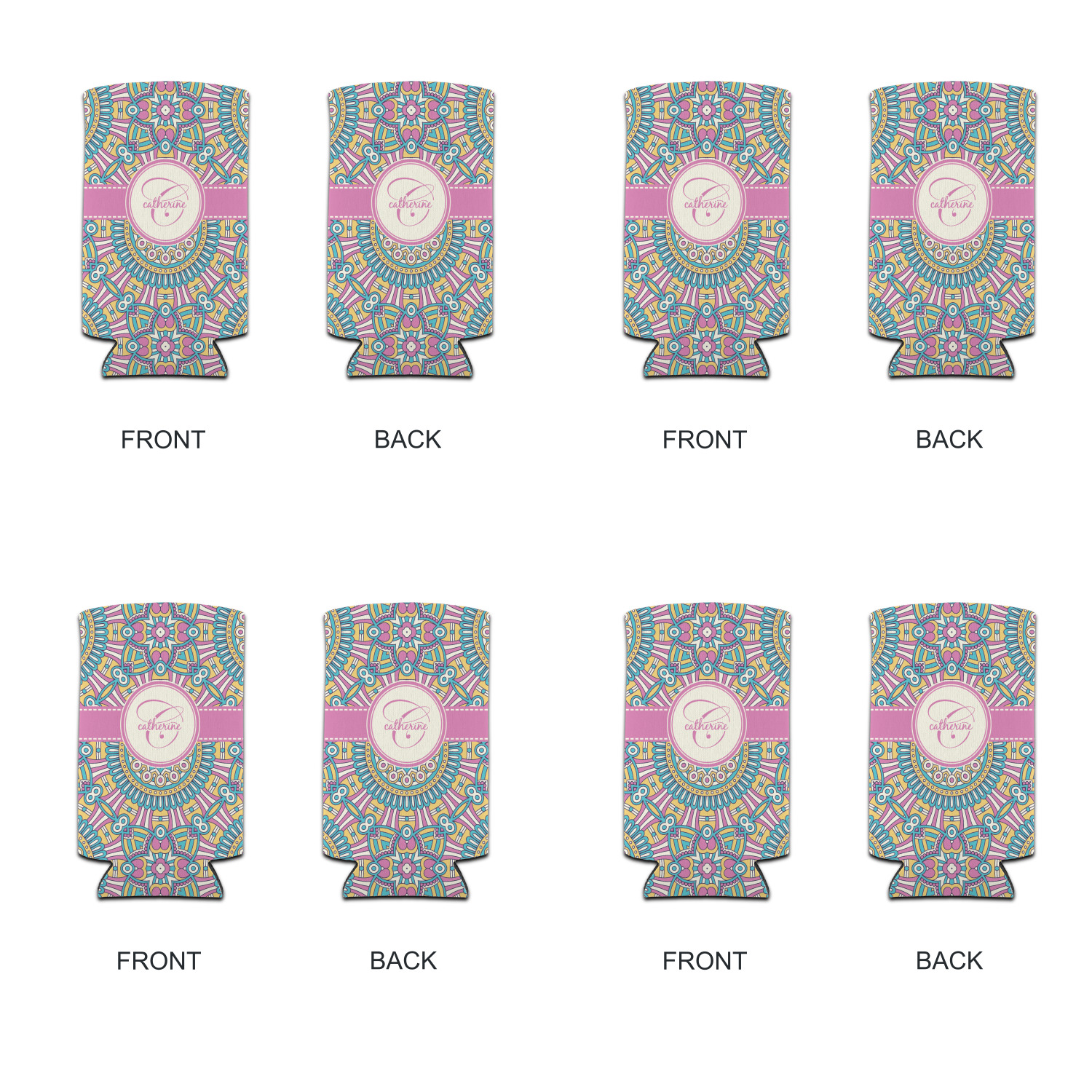 The designs main feature is its beautiful pattern. The pattern is filled with intricate detail and bohemian style shapes. The colors are a drastic difference from what you would normally see in a bohemian design, making this design all the more unique. You are able to put your personalization in the frame in the middle. The colors you will find are a bubble gum pink, teal, light yellow, and white.