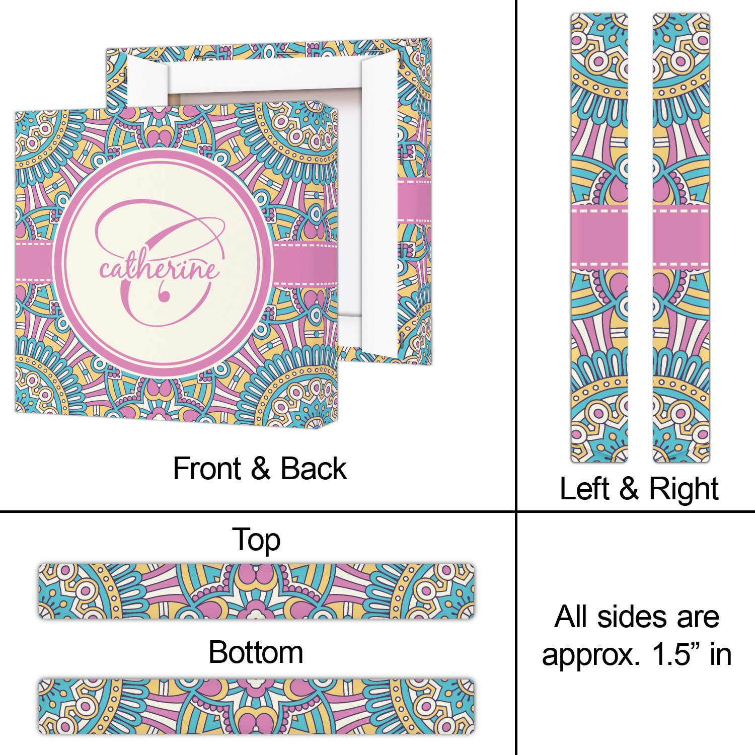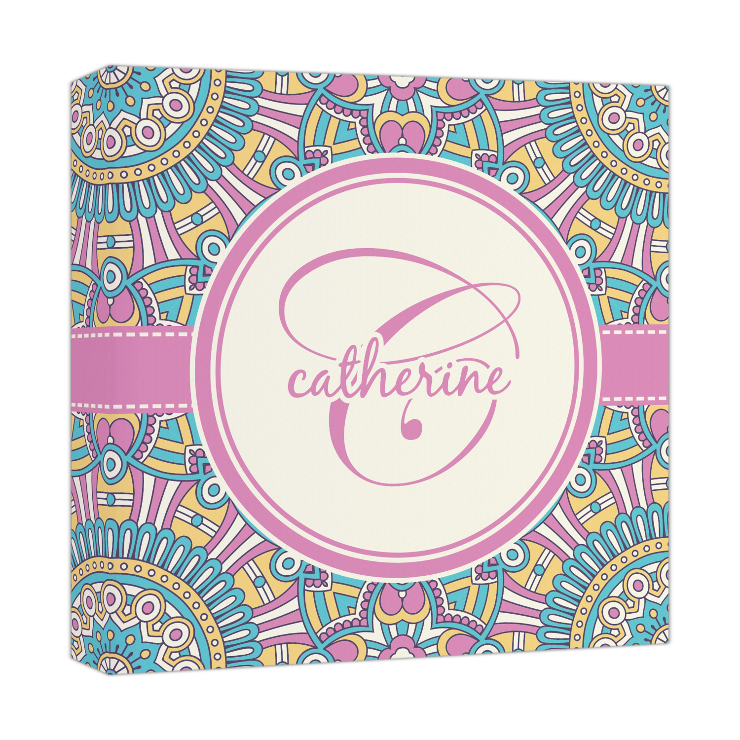 The designs main feature is its beautiful pattern. The pattern is filled with intricate detail and bohemian style shapes. The colors are a drastic difference from what you would normally see in a bohemian design, making this design all the more unique. You are able to put your personalization in the frame in the middle. The colors you will find are a bubble gum pink, teal, light yellow, and white.