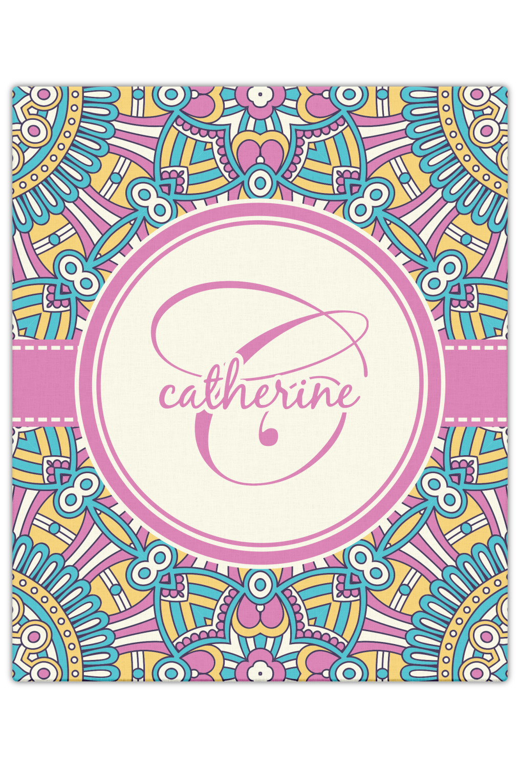 The designs main feature is its beautiful pattern. The pattern is filled with intricate detail and bohemian style shapes. The colors are a drastic difference from what you would normally see in a bohemian design, making this design all the more unique. You are able to put your personalization in the frame in the middle. The colors you will find are a bubble gum pink, teal, light yellow, and white.