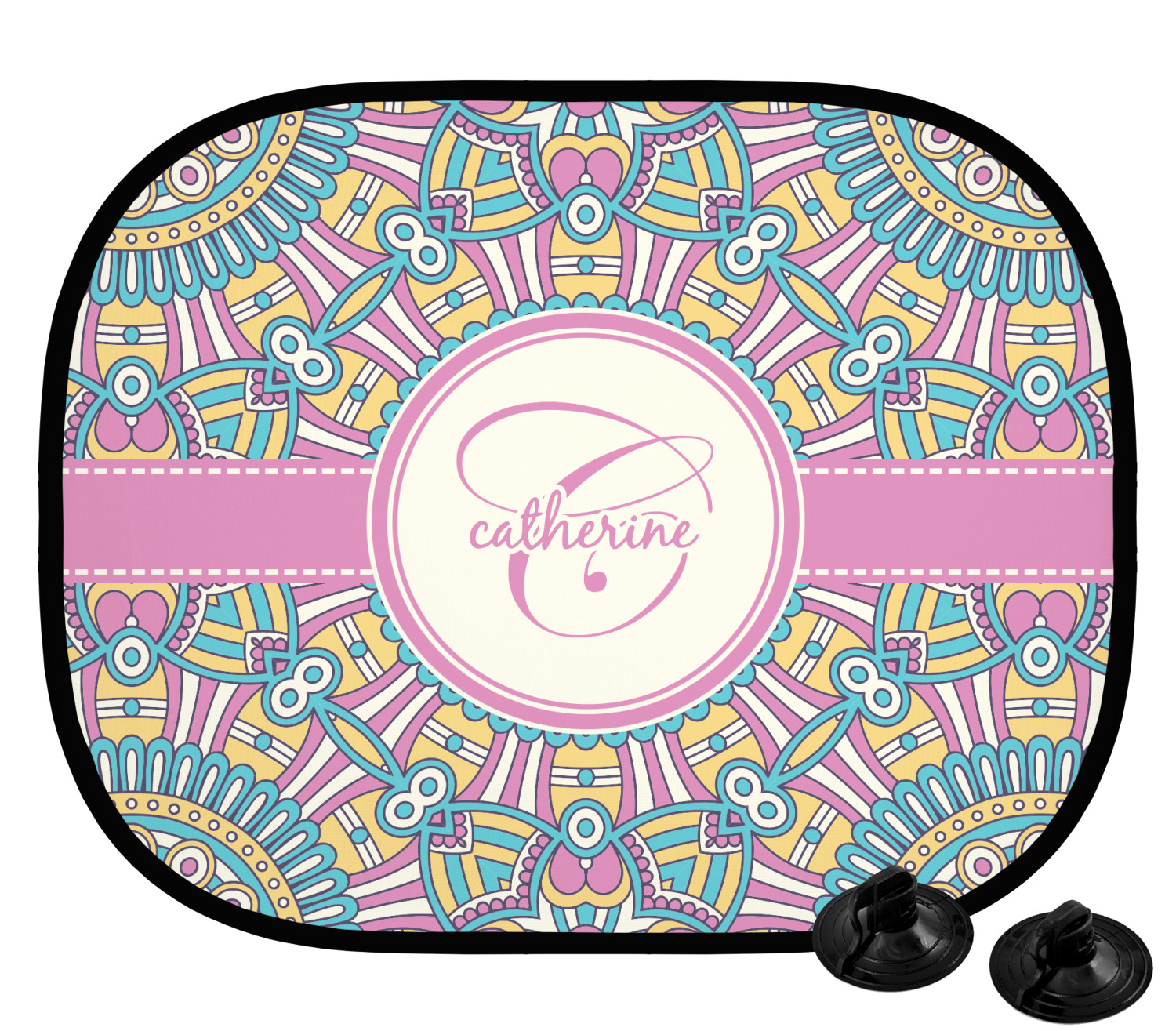 Our custom car sun shade is fabricated from a polyester netting that manages to block out most harsh rays, while still allowing some light to come through. A metal ring encircles the polyester netting, which grants durability and stiffness to the shade. We print your personalized design on the entire surface of the product. Two black suction cups accompany this product; the pair clip onto either side of the shade and allows for easy attachment and removal. Each shade measures at 17.25" x 14.25". We suggest that you measure the side windows of your car to ensure that this car window shade is a proper fit.
