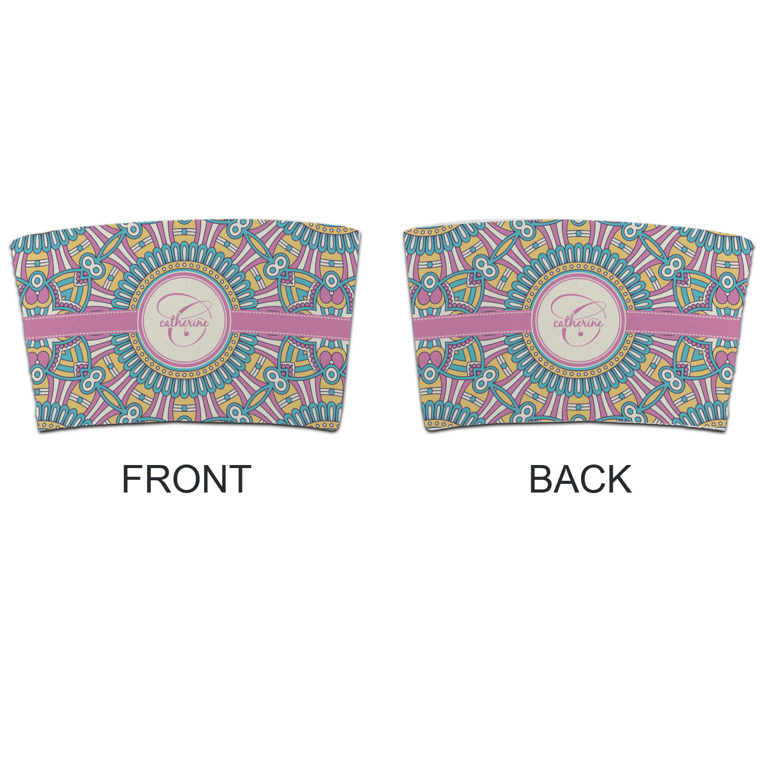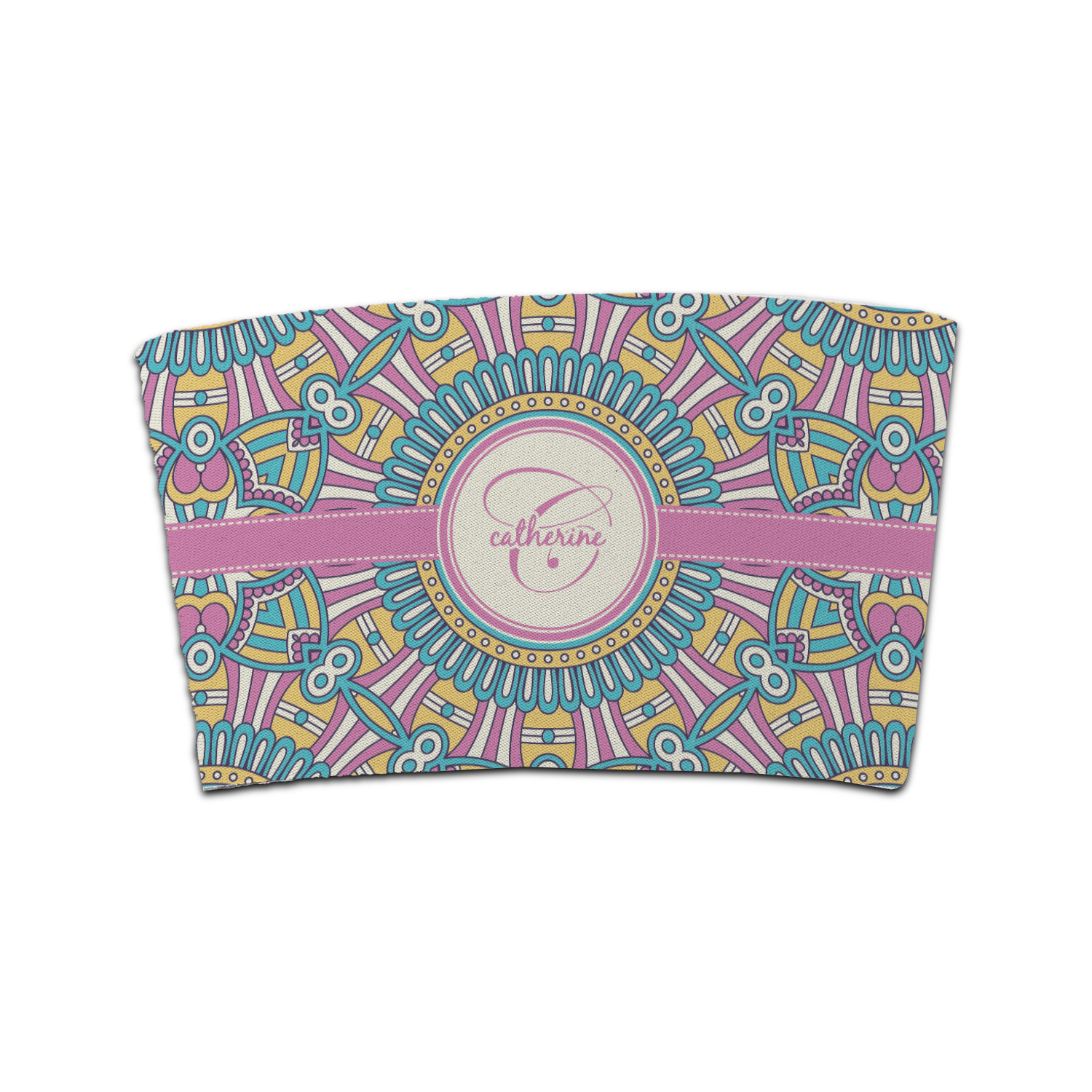 The designs main feature is its beautiful pattern. The pattern is filled with intricate detail and bohemian style shapes. The colors are a drastic difference from what you would normally see in a bohemian design, making this design all the more unique. You are able to put your personalization in the frame in the middle. The colors you will find are a bubble gum pink, teal, light yellow, and white.