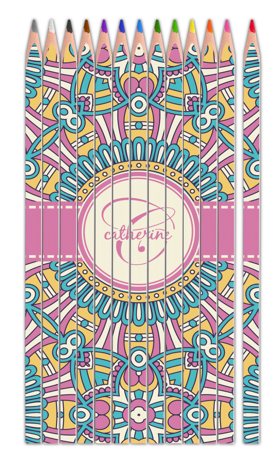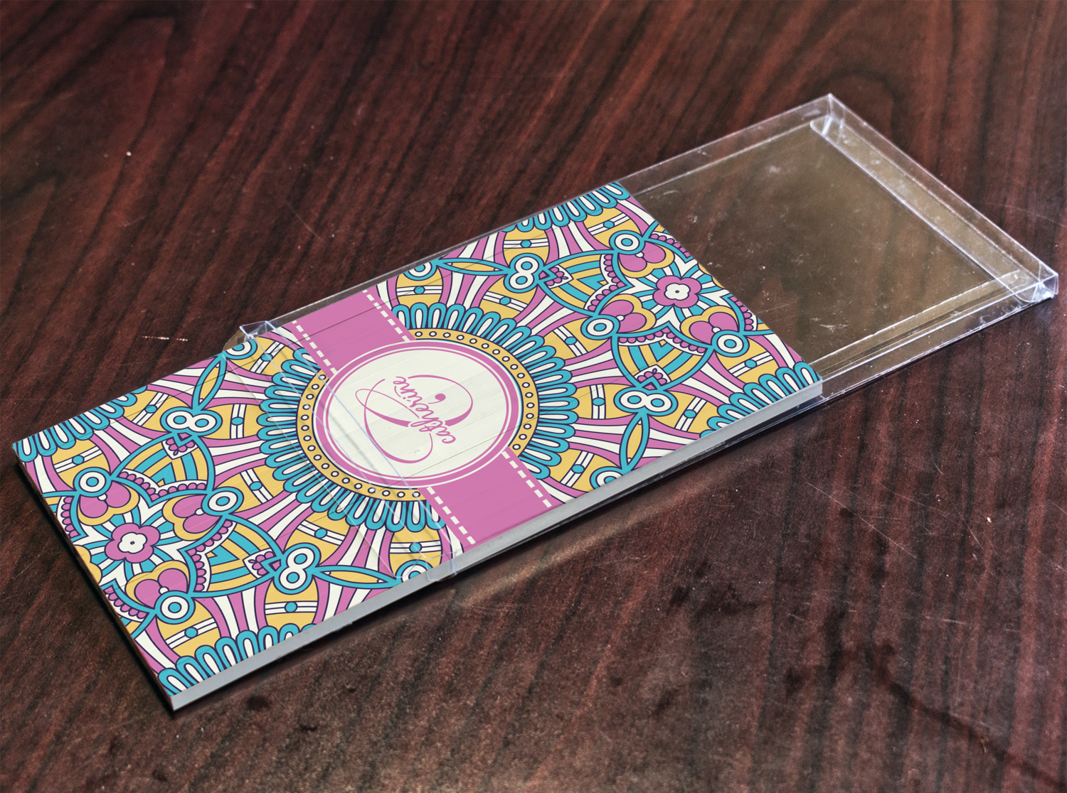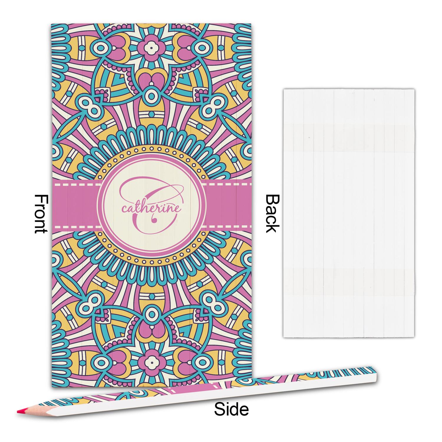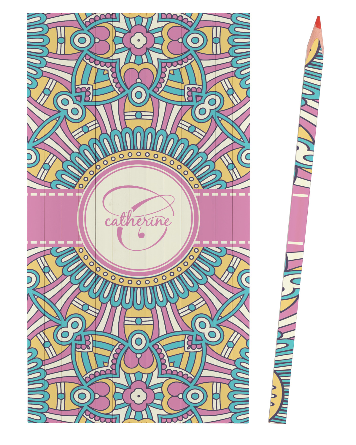 The designs main feature is its beautiful pattern. The pattern is filled with intricate detail and bohemian style shapes. The colors are a drastic difference from what you would normally see in a bohemian design, making this design all the more unique. You are able to put your personalization in the frame in the middle. The colors you will find are a bubble gum pink, teal, light yellow, and white.
