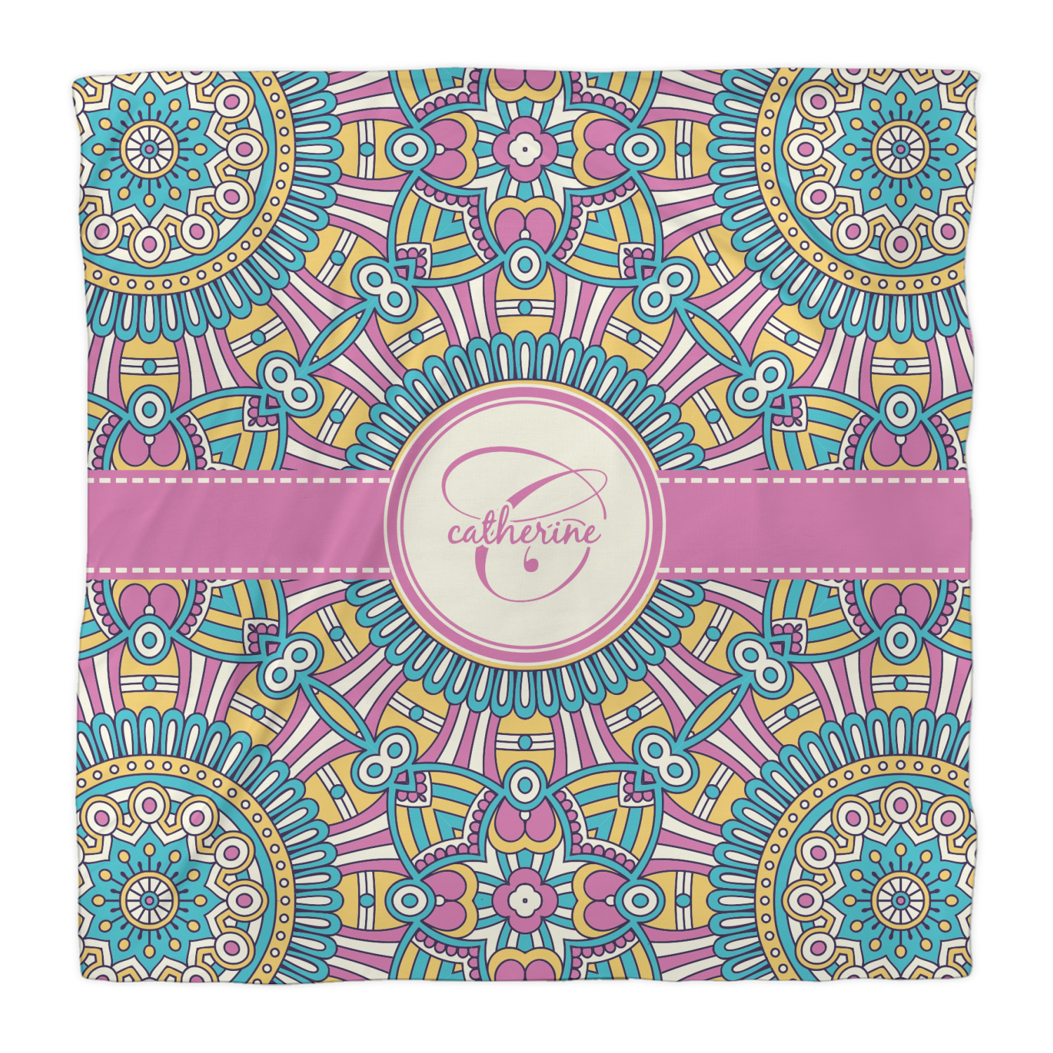 The designs main feature is its beautiful pattern. The pattern is filled with intricate detail and bohemian style shapes. The colors are a drastic difference from what you would normally see in a bohemian design, making this design all the more unique. You are able to put your personalization in the frame in the middle. The colors you will find are a bubble gum pink, teal, light yellow, and white.