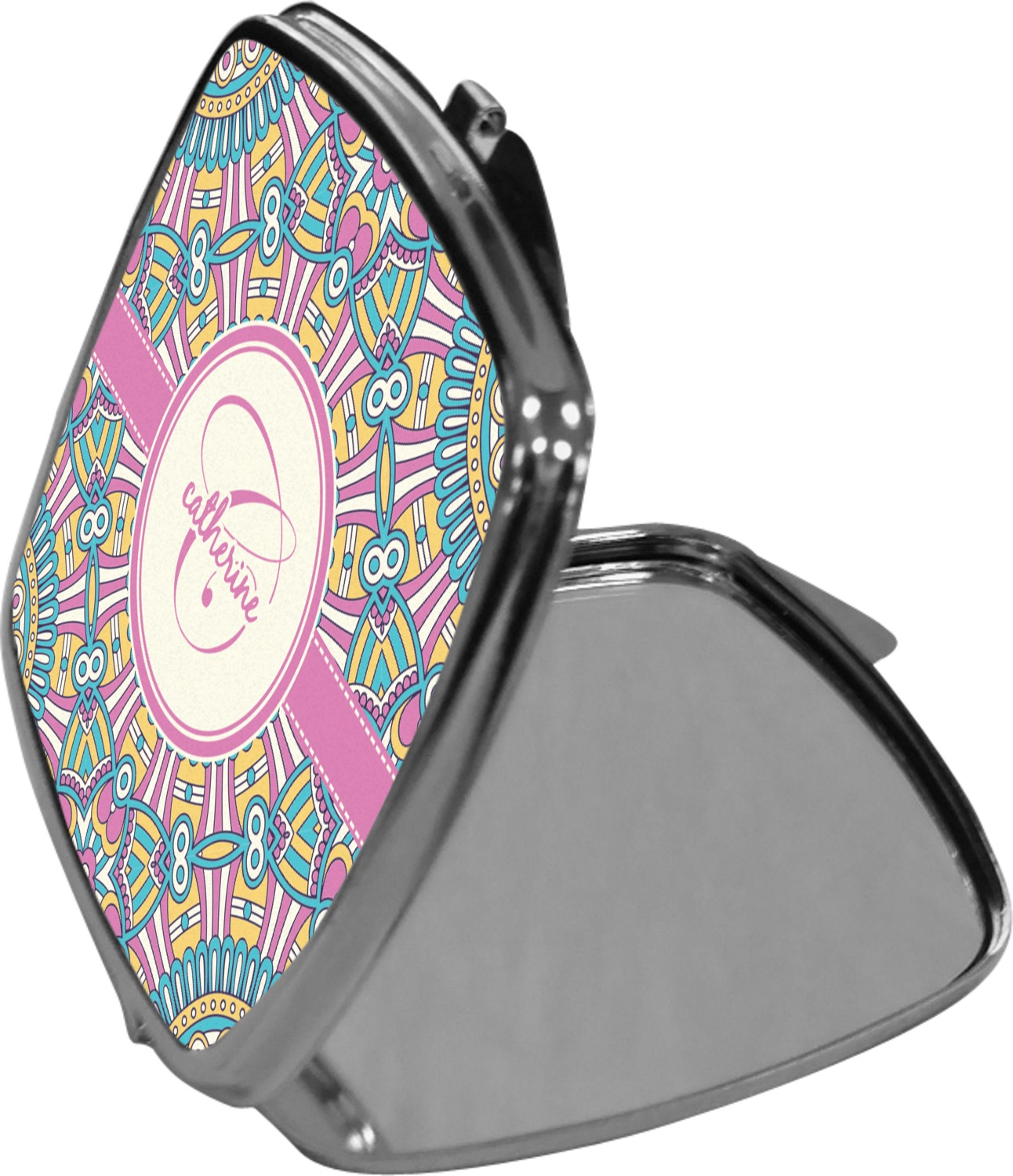 Our compact mirrors are customized with your design on one side. The other side is patterned silver tone metal. Inside, there are two mirrors.
