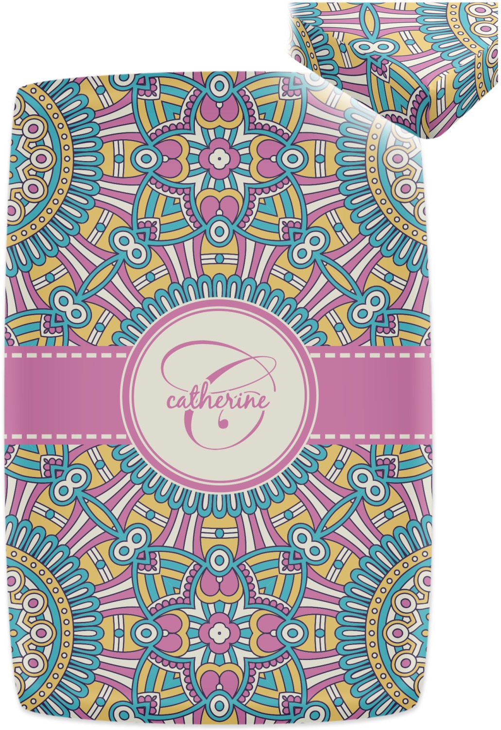 The designs main feature is its beautiful pattern. The pattern is filled with intricate detail and bohemian style shapes. The colors are a drastic difference from what you would normally see in a bohemian design, making this design all the more unique. You are able to put your personalization in the frame in the middle. The colors you will find are a bubble gum pink, teal, light yellow, and white.