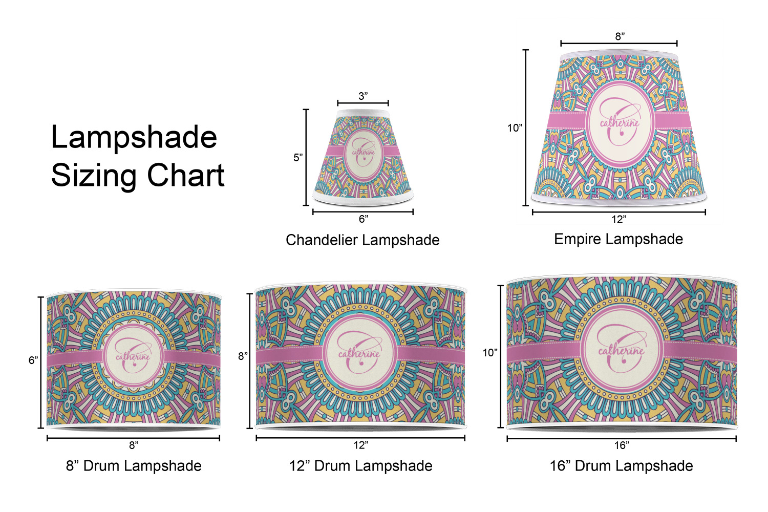 Our customized lamp shades also come in 3 different sizes: 8", 12" and 16", measuring at 8" in diameter by 6" tall, 12" in diameter by 8" tall, and 16" in diameter by 10" tall, respectively.