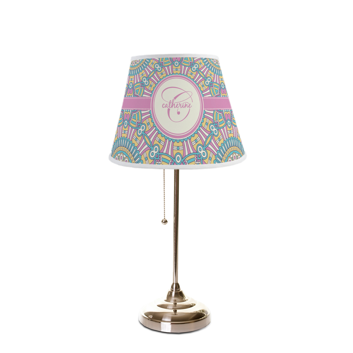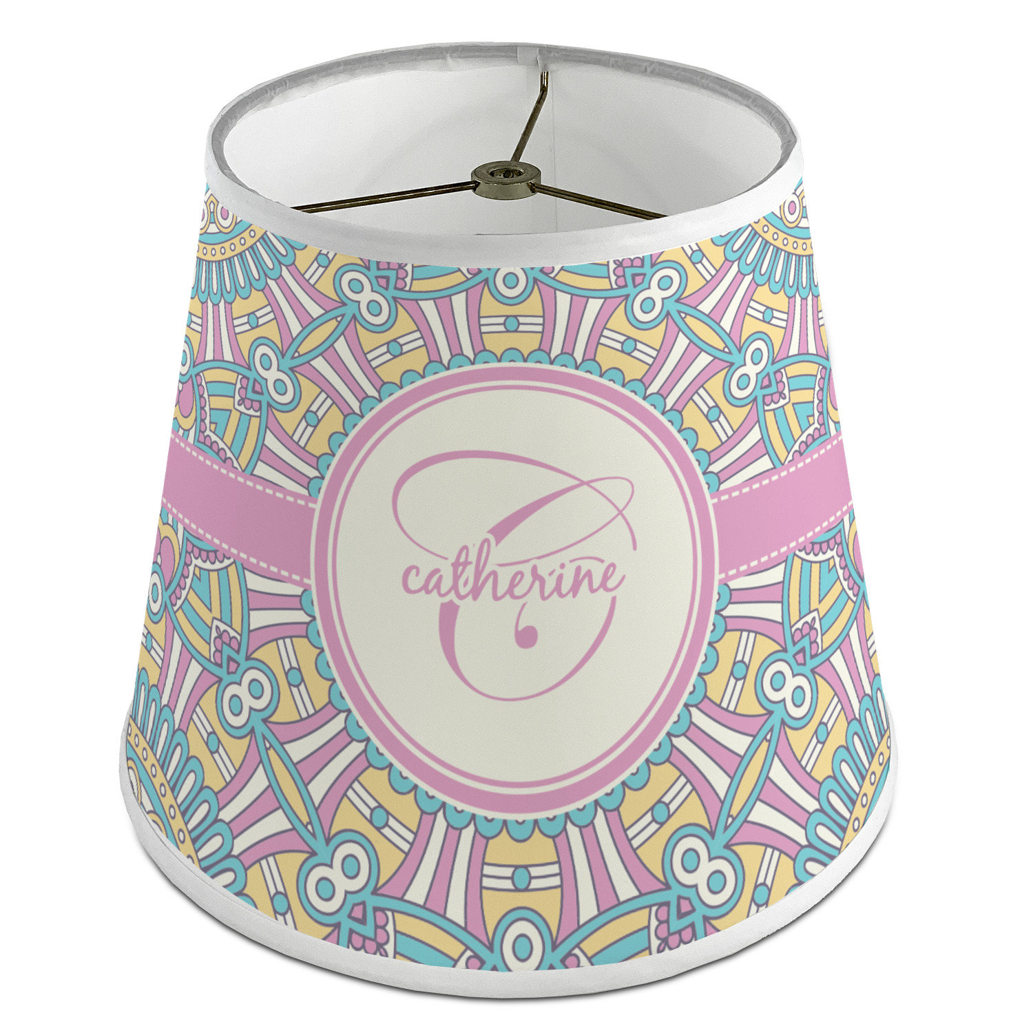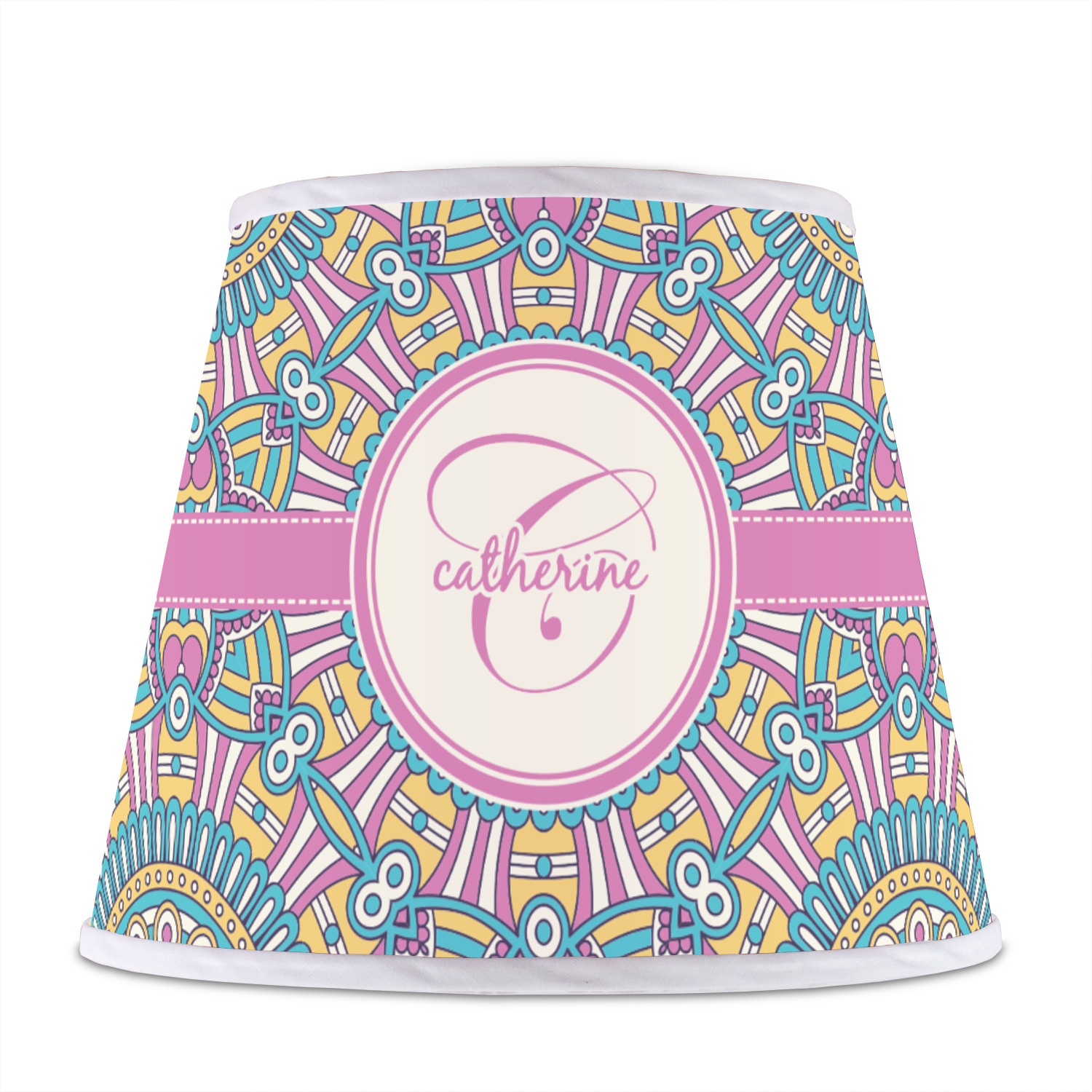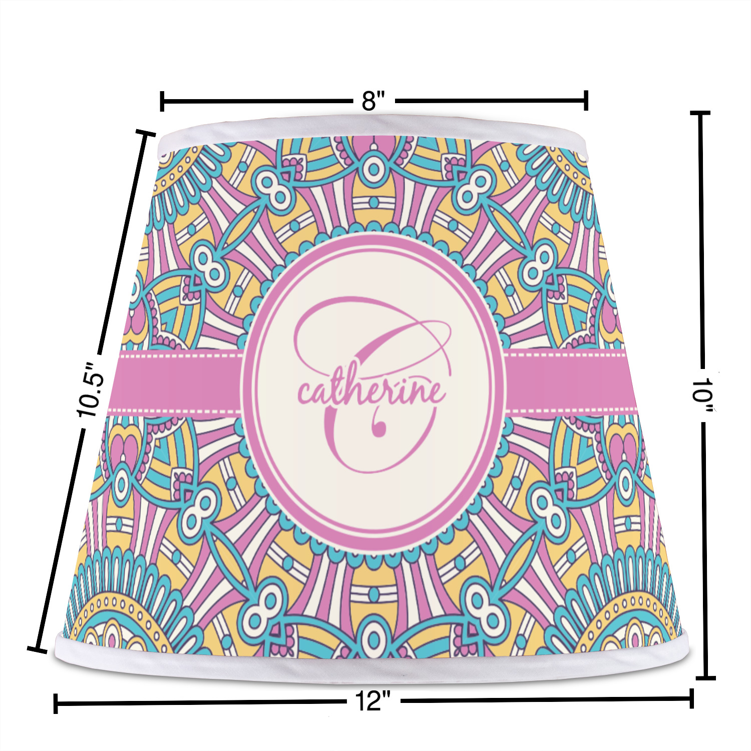 The base of this lampshade is 12 inches in diameter, and the top spans 8 inches in diameter. The total height of the lampshade is 10 inches. The angled nature of this custom lampshade concentrates the light, making it ideal for smaller spaces. This lampshade is made of matte, polyfilm, and displays your customization in its middle. The top and bottom of this colorful lamp shade are lined with a white fabric ribbon (which can be replaced with black inside the design studio) which frames your design and creates a sophisticated finish. As an UNO fitter lampshade, this unique lamp shade will fit a variety of bases.