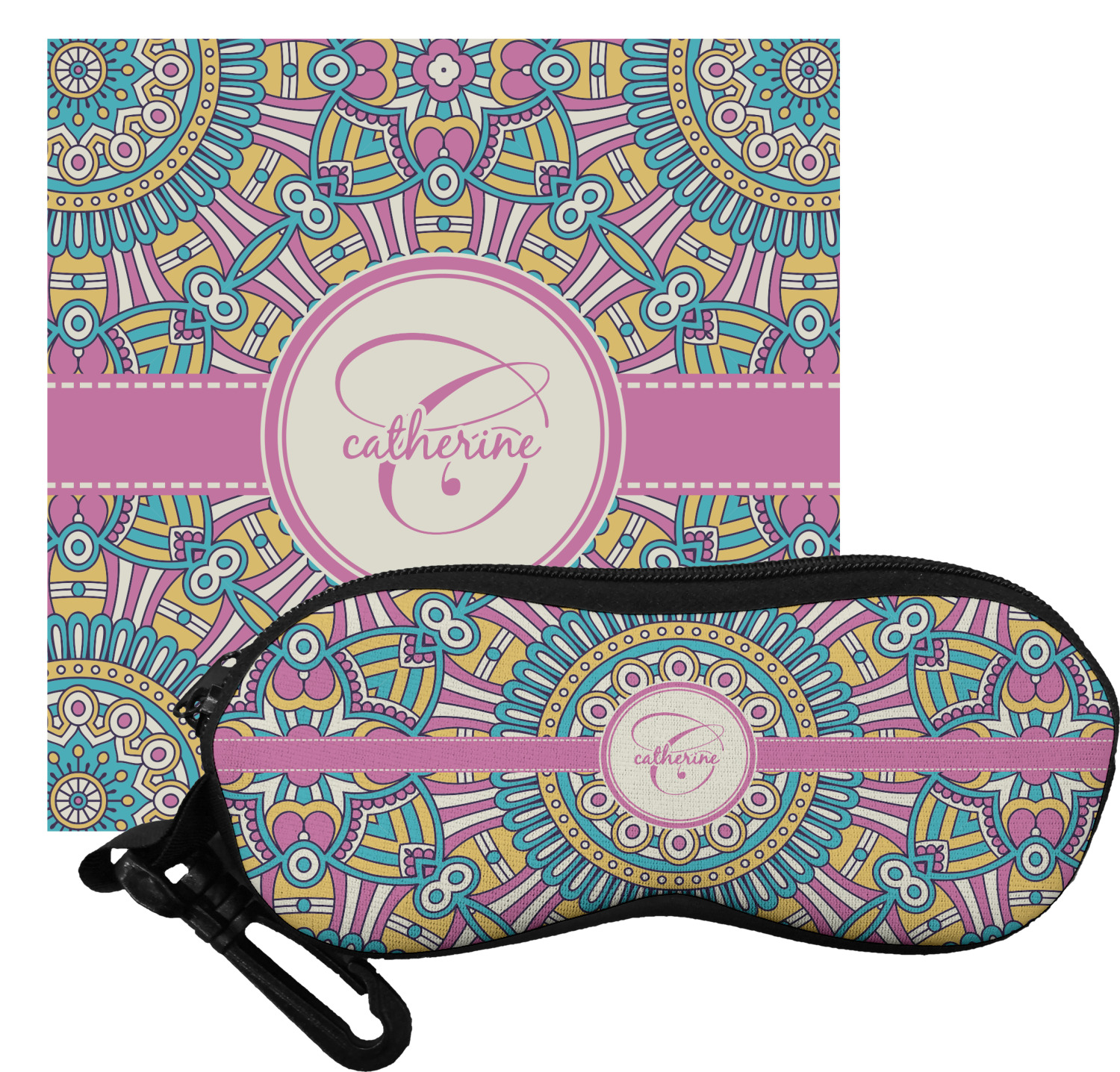 The cases have the design on both sides, a black zipper, and clips for hanging on a belt buckle or purse strap and also include matching lens cloths.