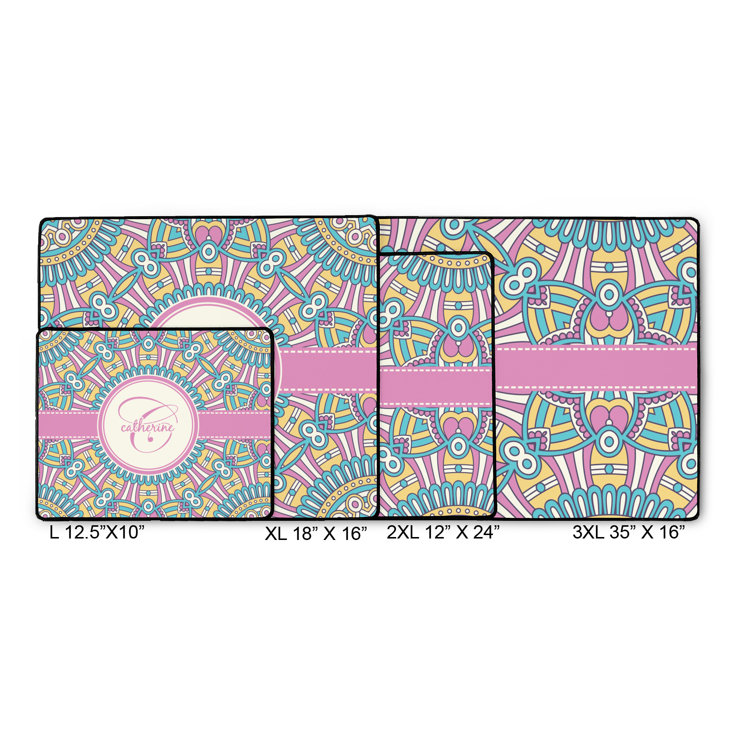 The designs main feature is its beautiful pattern. The pattern is filled with intricate detail and bohemian style shapes. The colors are a drastic difference from what you would normally see in a bohemian design, making this design all the more unique. You are able to put your personalization in the frame in the middle. The colors you will find are a bubble gum pink, teal, light yellow, and white.