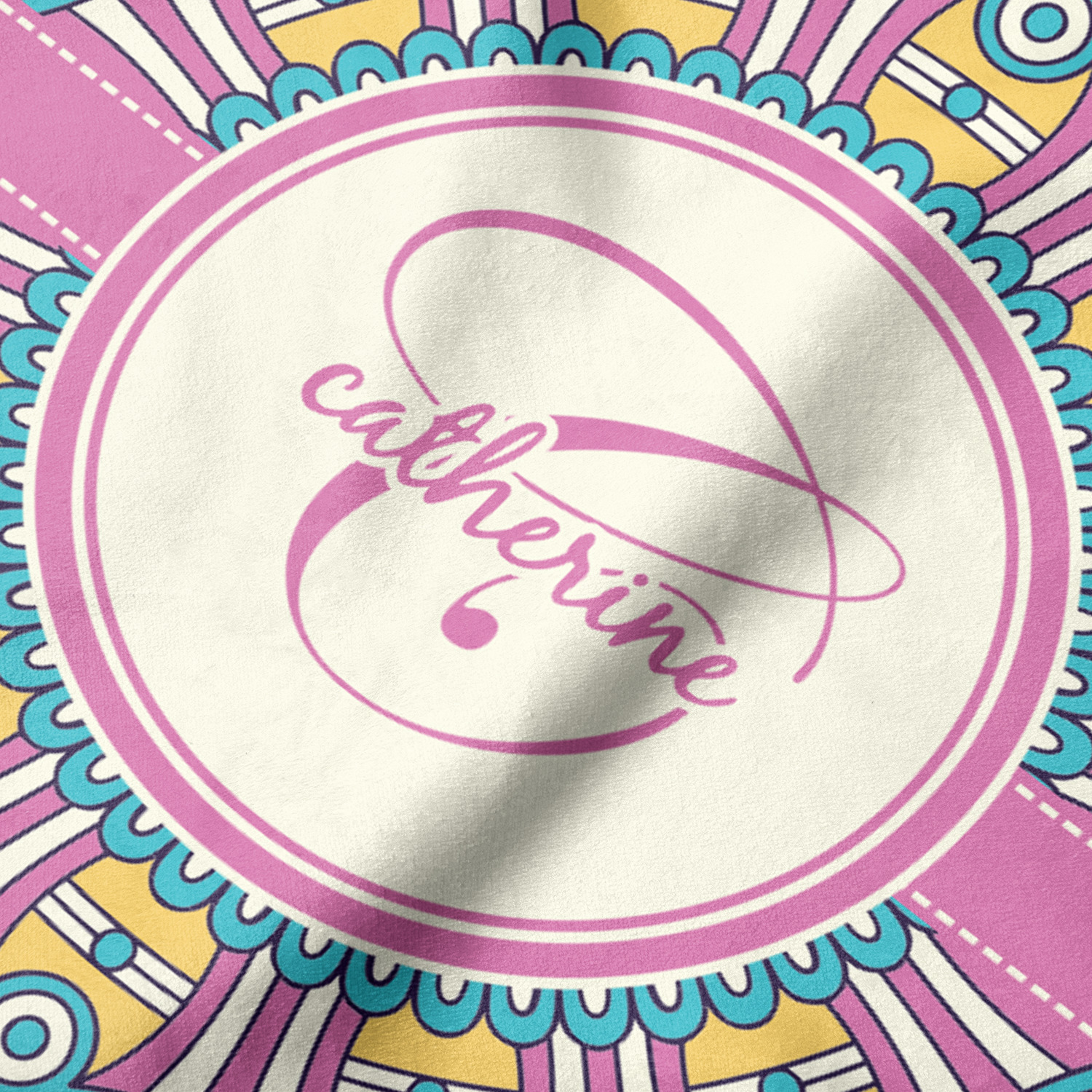 The designs main feature is its beautiful pattern. The pattern is filled with intricate detail and bohemian style shapes. The colors are a drastic difference from what you would normally see in a bohemian design, making this design all the more unique. You are able to put your personalization in the frame in the middle. The colors you will find are a bubble gum pink, teal, light yellow, and white.