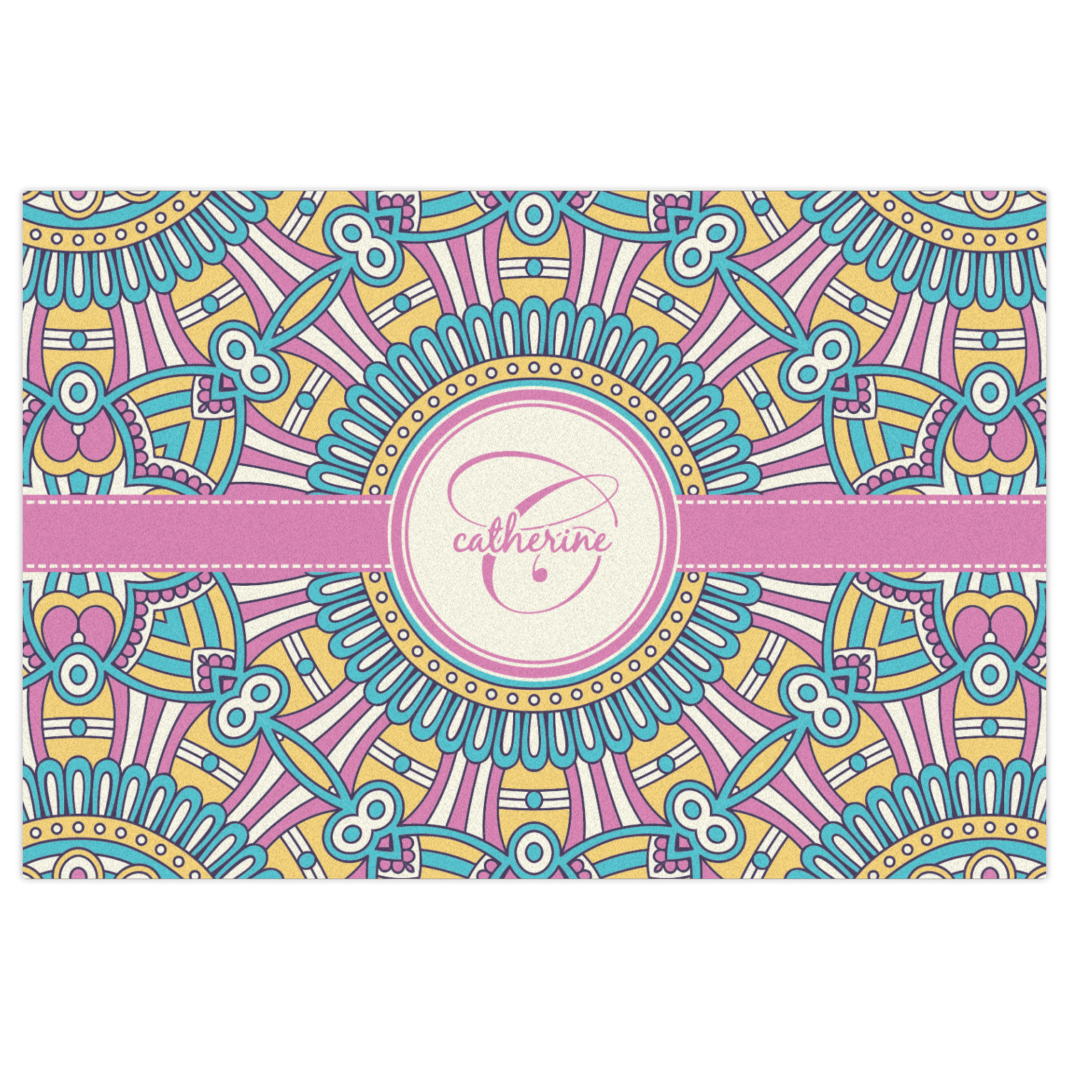 The designs main feature is its beautiful pattern. The pattern is filled with intricate detail and bohemian style shapes. The colors are a drastic difference from what you would normally see in a bohemian design, making this design all the more unique. You are able to put your personalization in the frame in the middle. The colors you will find are a bubble gum pink, teal, light yellow, and white.