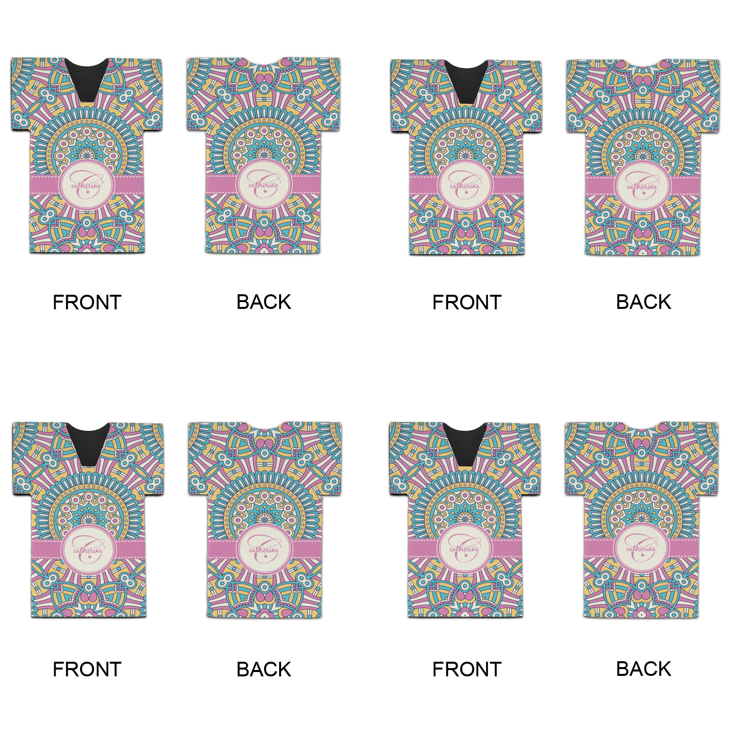 The designs main feature is its beautiful pattern. The pattern is filled with intricate detail and bohemian style shapes. The colors are a drastic difference from what you would normally see in a bohemian design, making this design all the more unique. You are able to put your personalization in the frame in the middle. The colors you will find are a bubble gum pink, teal, light yellow, and white.