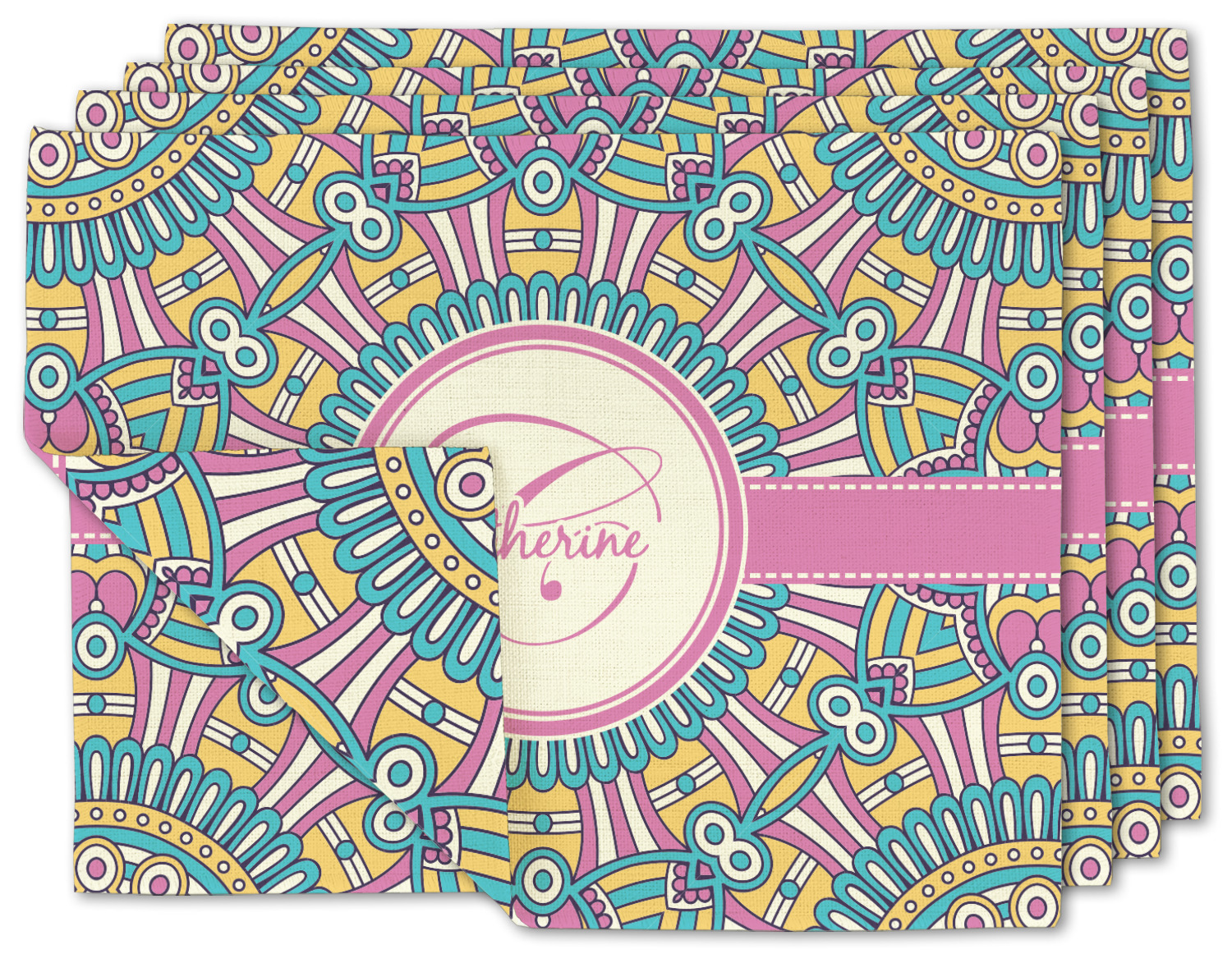 The designs main feature is its beautiful pattern. The pattern is filled with intricate detail and bohemian style shapes. The colors are a drastic difference from what you would normally see in a bohemian design, making this design all the more unique. You are able to put your personalization in the frame in the middle. The colors you will find are a bubble gum pink, teal, light yellow, and white.
