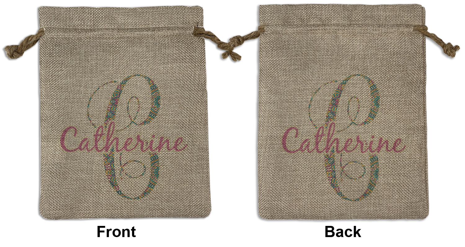 We sell our Burlap Gift Bags in 3 variant sized bags. Made with burlap polyester, each personalized bag can be secured with a twine drawstring pull. Your custom design is available to print on one side or both sides - completely up to you! The sizes of the bags measure approximately 4.5" x 6.5" for the smallest size, 6.5" x 8.0" for the medium size, and 6.5" x 13.5" for the large-sized bag.