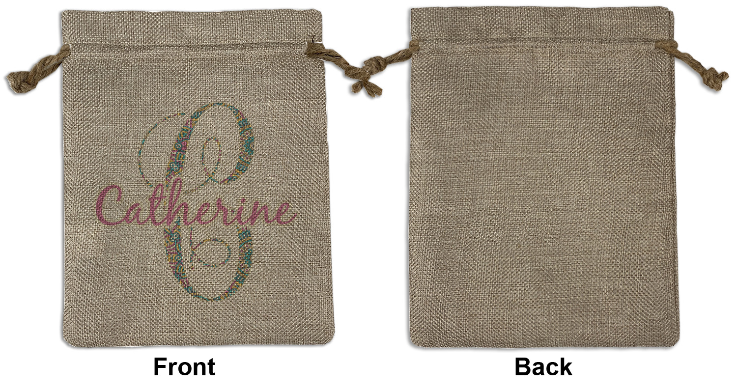 We sell our Burlap Gift Bags in 3 variant sized bags. Made with burlap polyester, each personalized bag can be secured with a twine drawstring pull. Your custom design is available to print on one side or both sides - completely up to you! The sizes of the bags measure approximately 4.5" x 6.5" for the smallest size, 6.5" x 8.0" for the medium size, and 6.5" x 13.5" for the large-sized bag.