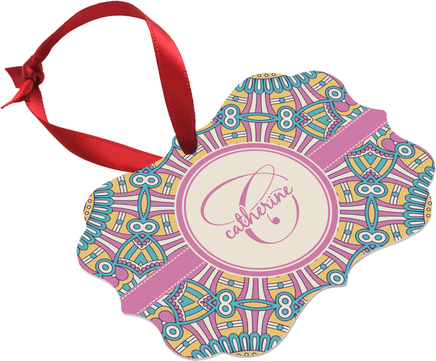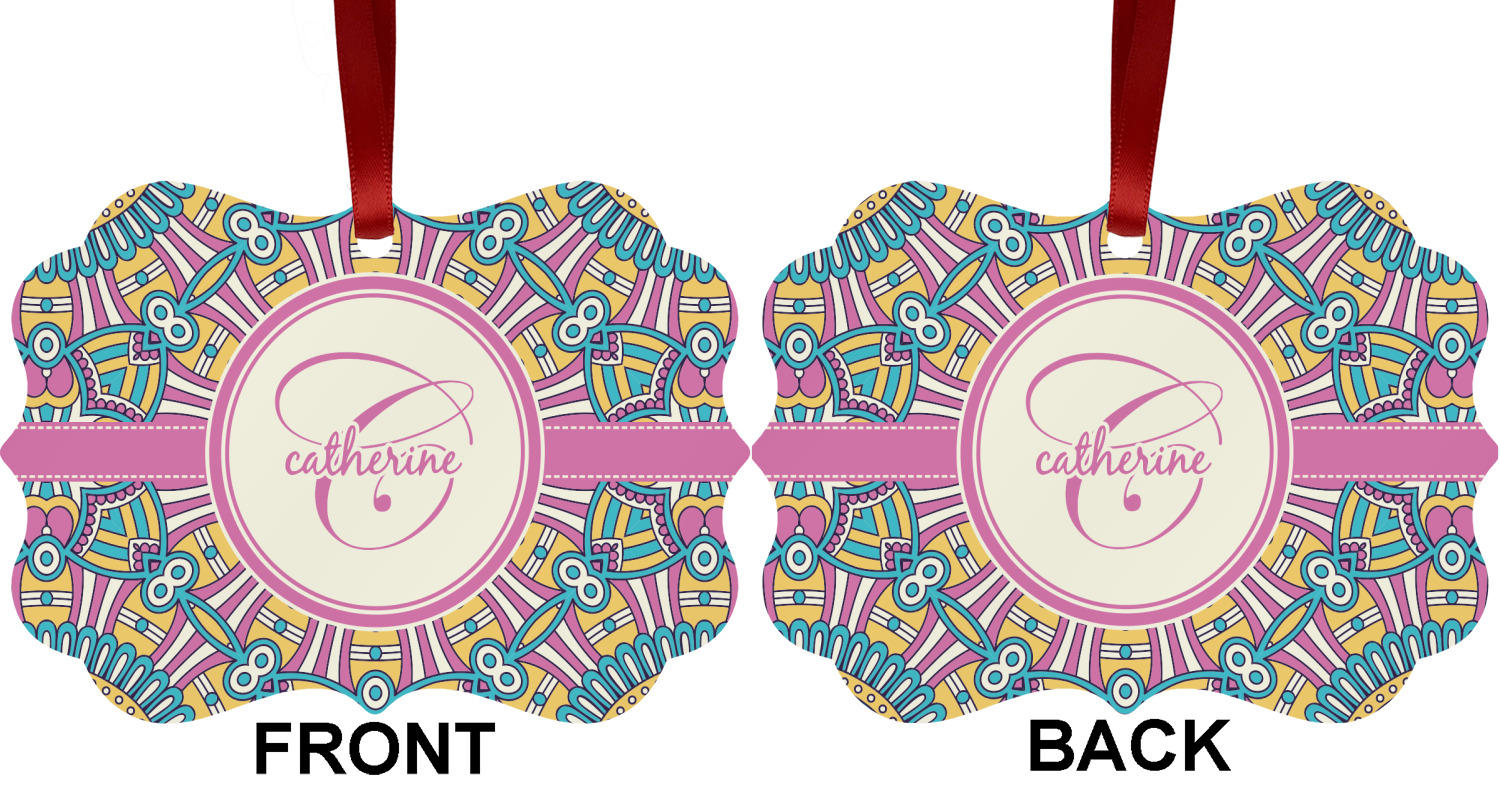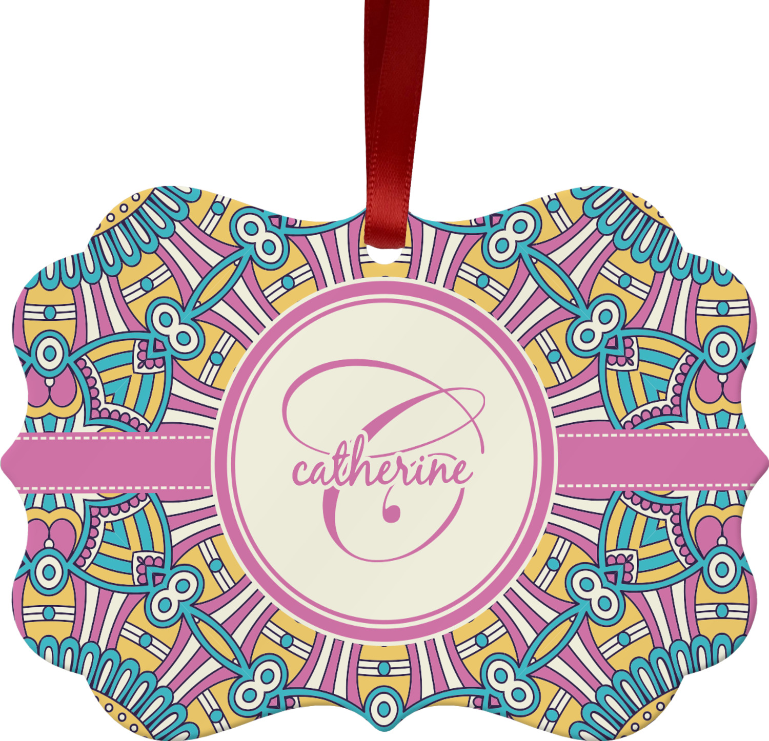 The designs main feature is its beautiful pattern. The pattern is filled with intricate detail and bohemian style shapes. The colors are a drastic difference from what you would normally see in a bohemian design, making this design all the more unique. You are able to put your personalization in the frame in the middle. The colors you will find are a bubble gum pink, teal, light yellow, and white.