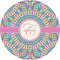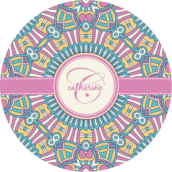 The designs main feature is its beautiful pattern. The pattern is filled with intricate detail and bohemian style shapes. The colors are a drastic difference from what you would normally see in a bohemian design, making this design all the more unique. You are able to put your personalization in the frame in the middle. The colors you will find are a bubble gum pink, teal, light yellow, and white.