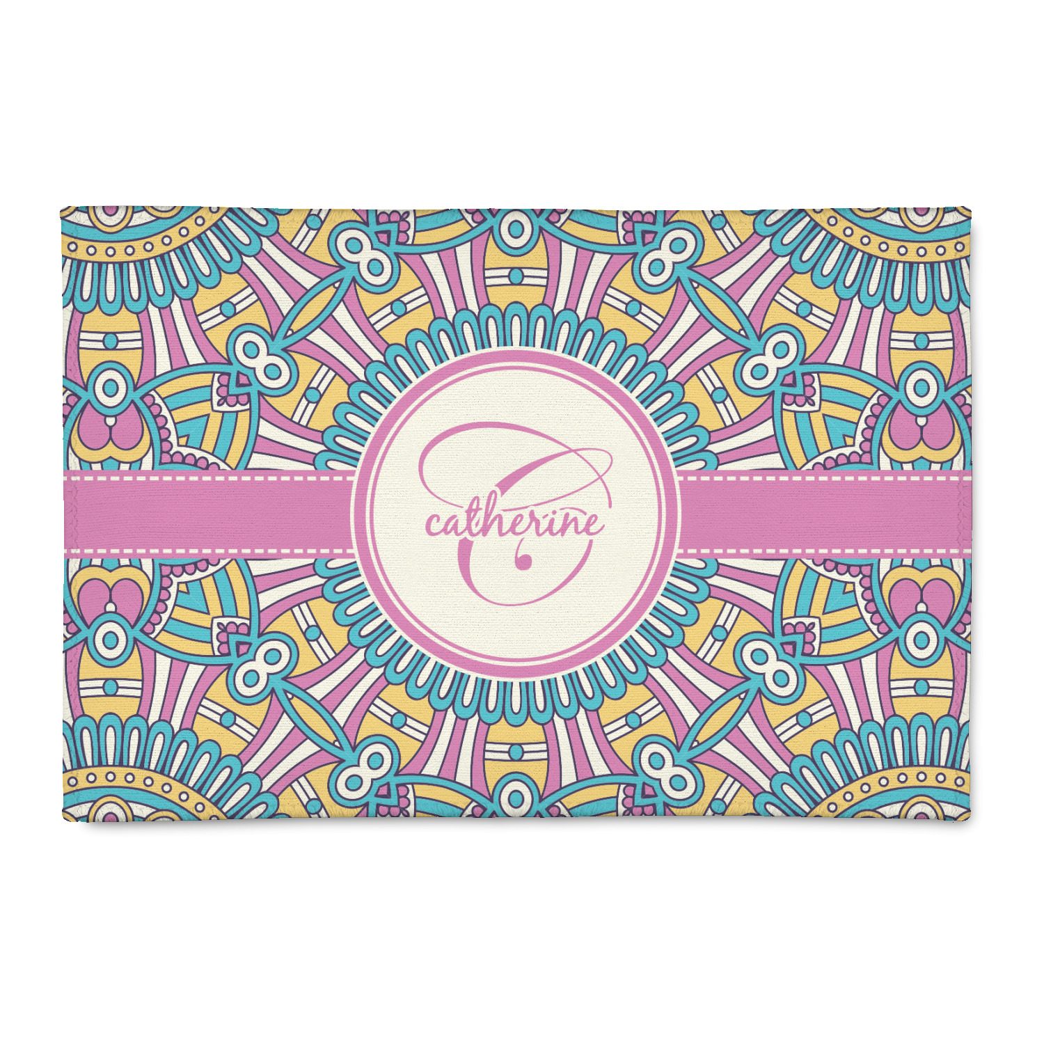 The designs main feature is its beautiful pattern. The pattern is filled with intricate detail and bohemian style shapes. The colors are a drastic difference from what you would normally see in a bohemian design, making this design all the more unique. You are able to put your personalization in the frame in the middle. The colors you will find are a bubble gum pink, teal, light yellow, and white.