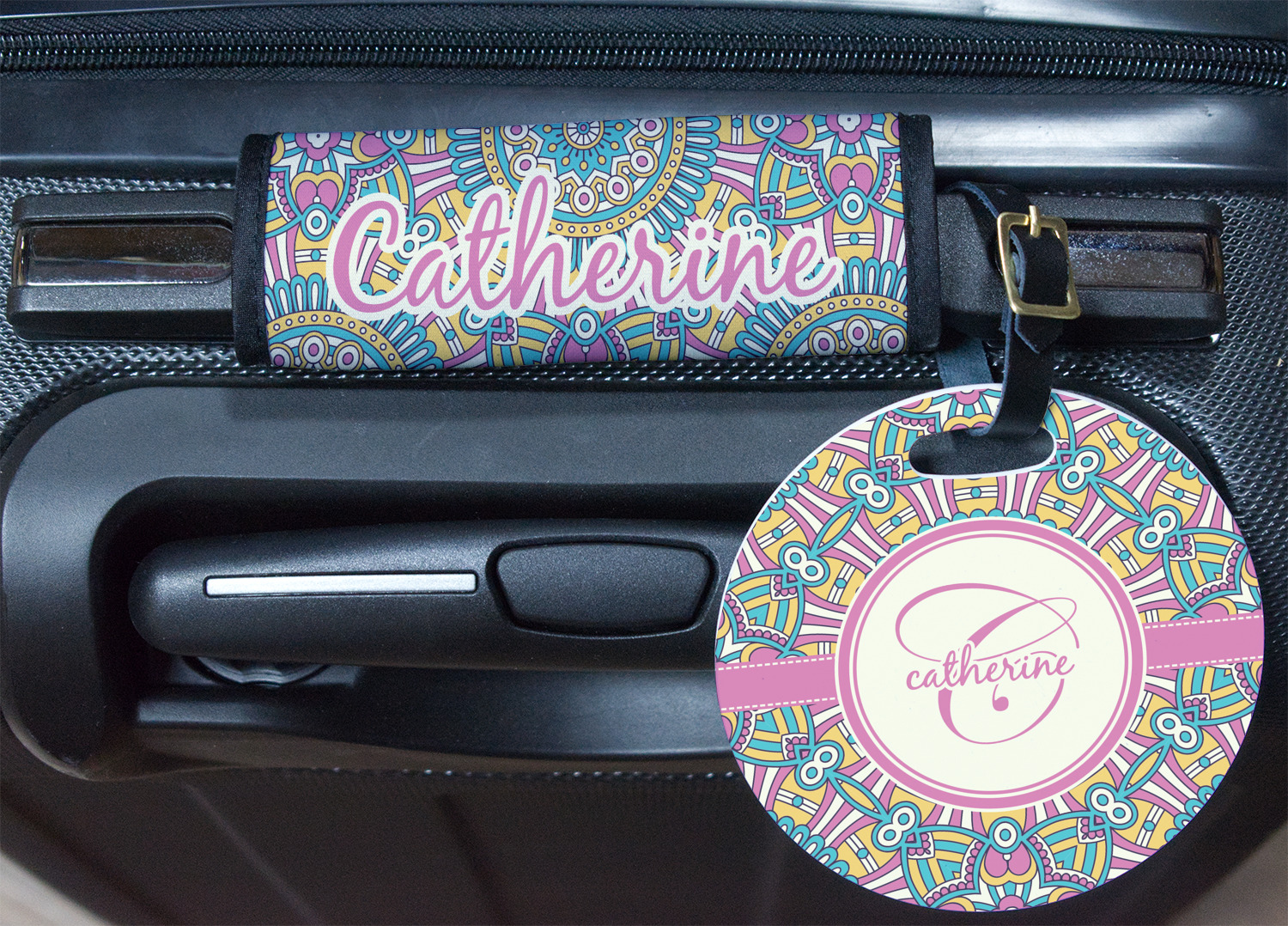 The designs main feature is its beautiful pattern. The pattern is filled with intricate detail and bohemian style shapes. The colors are a drastic difference from what you would normally see in a bohemian design, making this design all the more unique. You are able to put your personalization in the frame in the middle. The colors you will find are a bubble gum pink, teal, light yellow, and white.