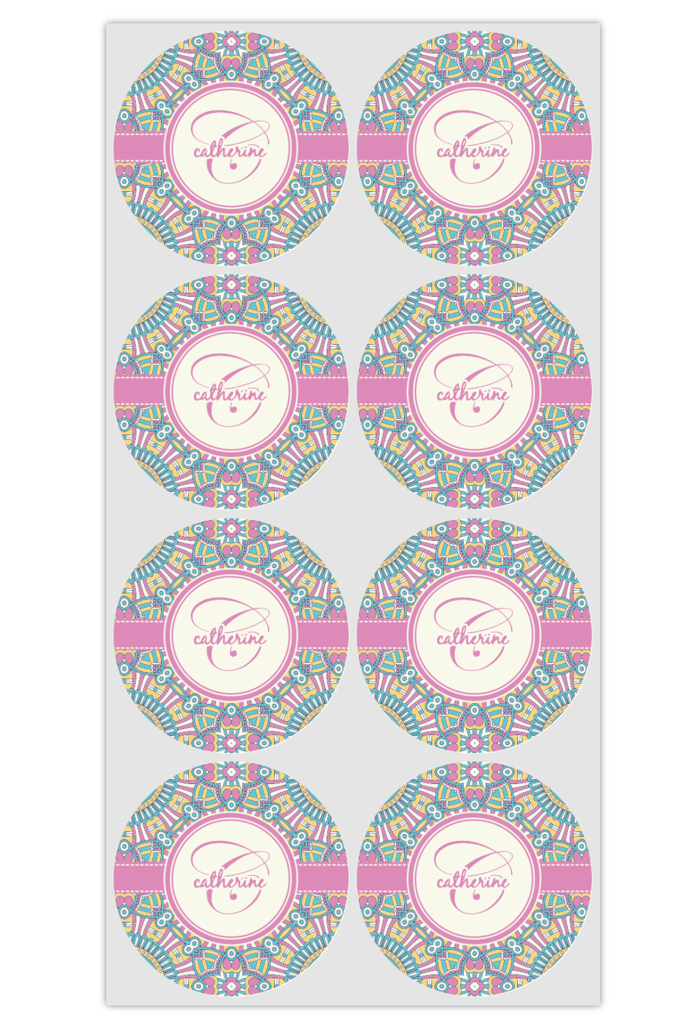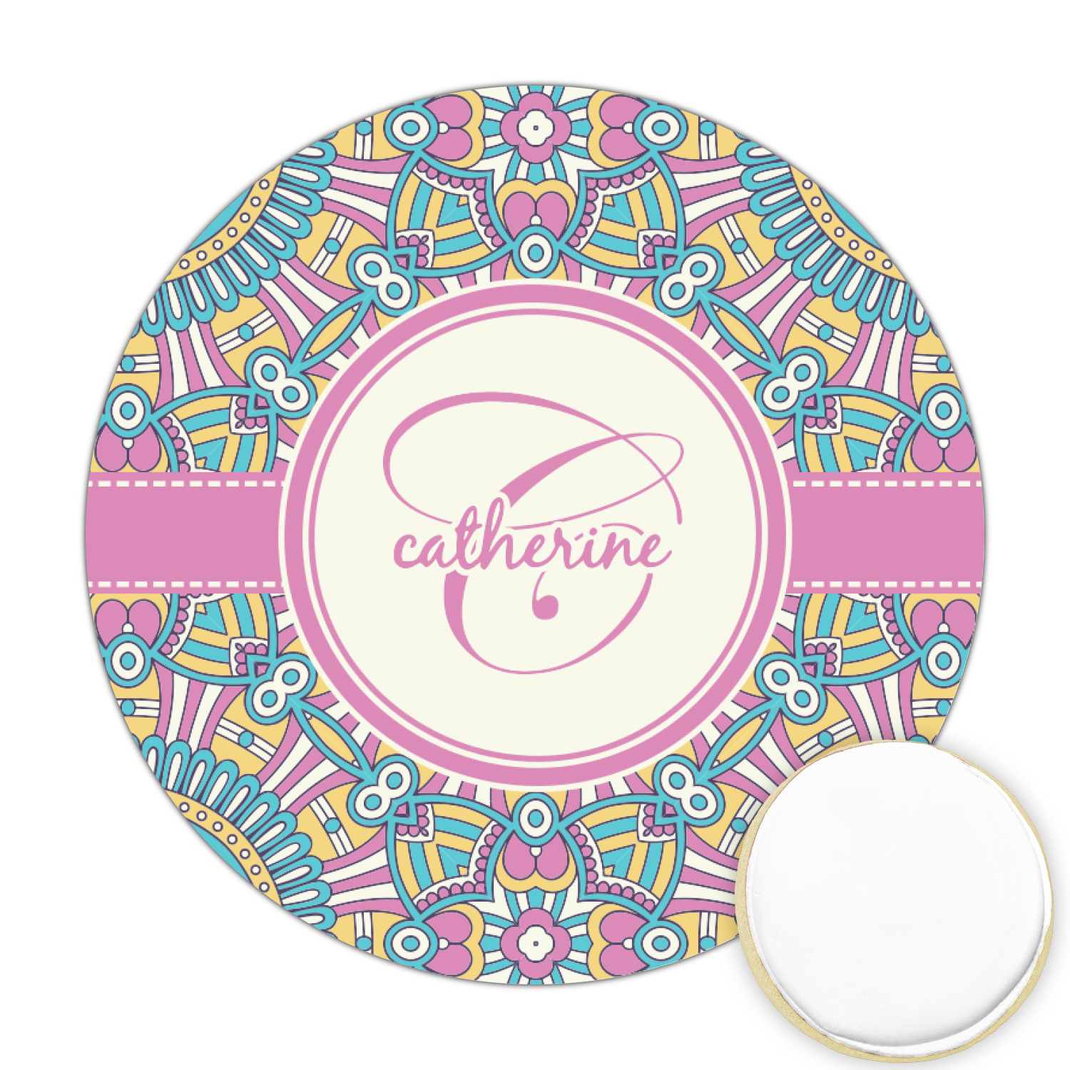The designs main feature is its beautiful pattern. The pattern is filled with intricate detail and bohemian style shapes. The colors are a drastic difference from what you would normally see in a bohemian design, making this design all the more unique. You are able to put your personalization in the frame in the middle. The colors you will find are a bubble gum pink, teal, light yellow, and white.