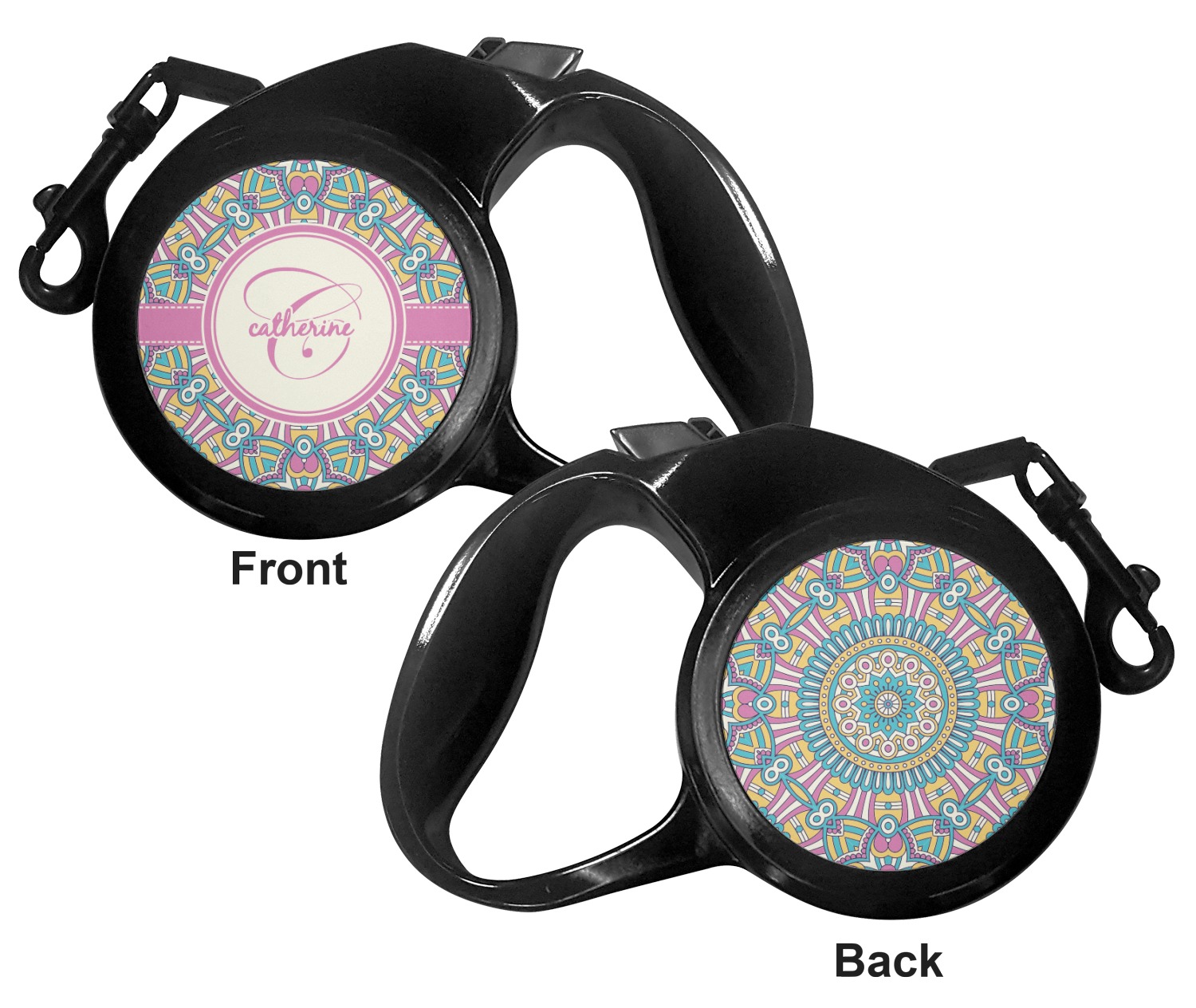 The leash's plastic handle is accommodating of your grip and displays your customization on both sides. The dog leash also features the traditional bolt snap clip, for easy fastening to your dog's collar. The leash and leash handle themselves are both black in color.