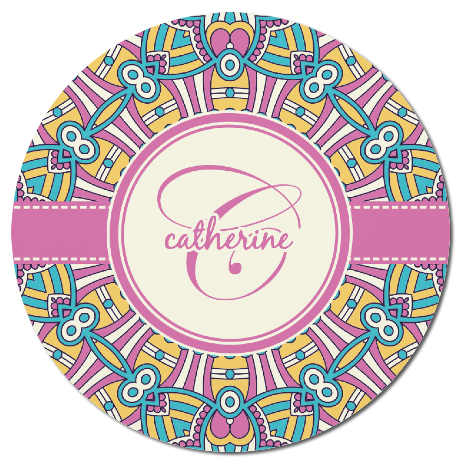 The designs main feature is its beautiful pattern. The pattern is filled with intricate detail and bohemian style shapes. The colors are a drastic difference from what you would normally see in a bohemian design, making this design all the more unique. You are able to put your personalization in the frame in the middle. The colors you will find are a bubble gum pink, teal, light yellow, and white.