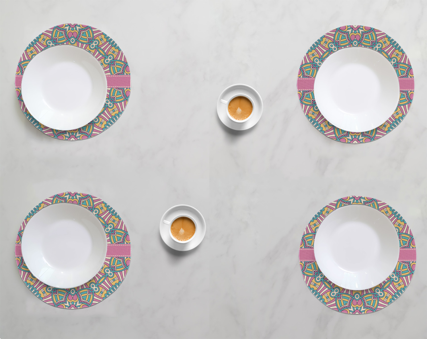 The designs main feature is its beautiful pattern. The pattern is filled with intricate detail and bohemian style shapes. The colors are a drastic difference from what you would normally see in a bohemian design, making this design all the more unique. You are able to put your personalization in the frame in the middle. The colors you will find are a bubble gum pink, teal, light yellow, and white.