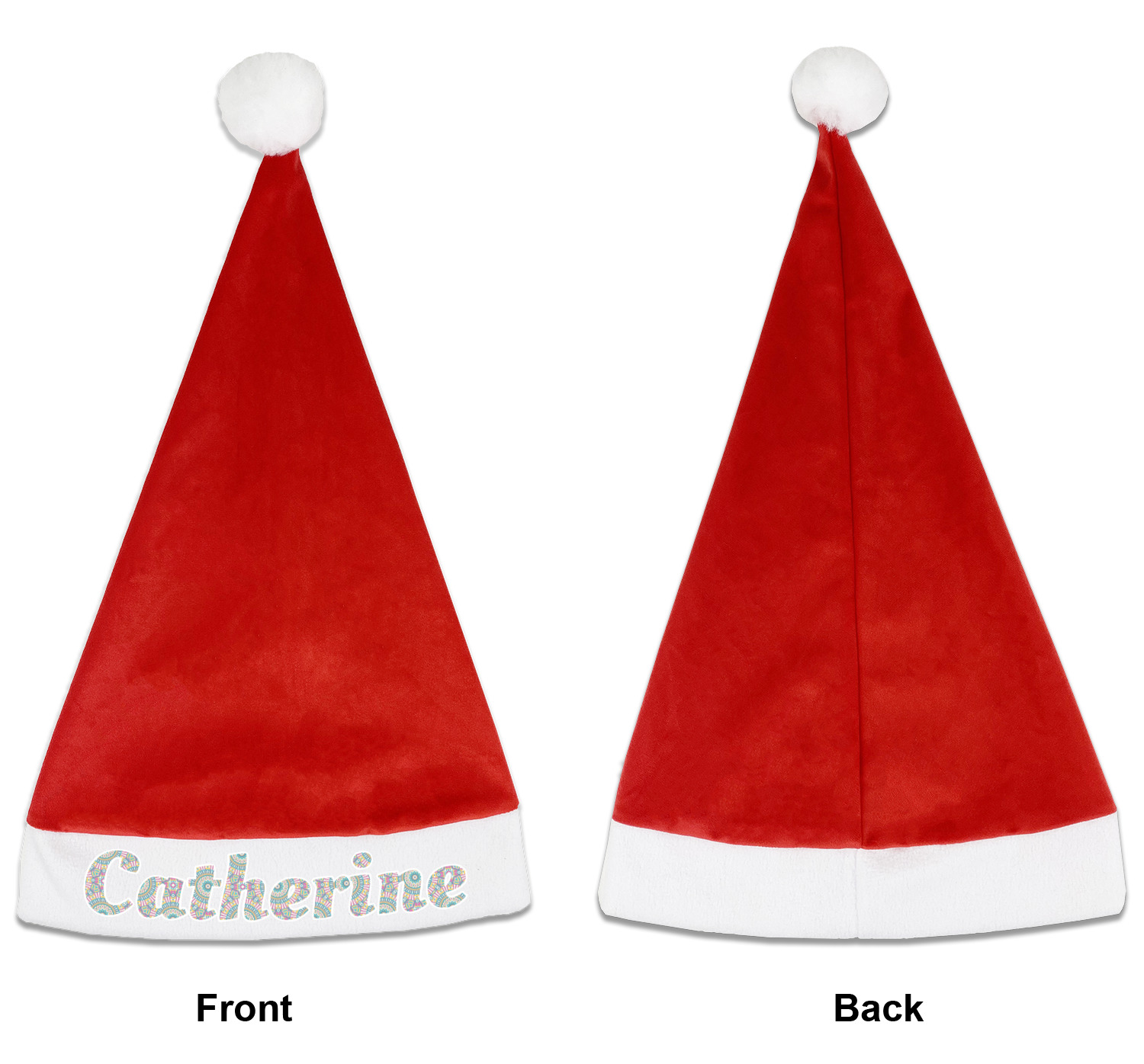 Our Santa hats are a soft, velvety polyester material. These customizable Santa hats are a classic red with white brimming and pom pom ball hanging off the hat tail just like Santa Claus! Each personalized Santa hat is approximately 17.5 L x 11.8 W. We offer two different styles to print your designs on the white brim - front or front & back.