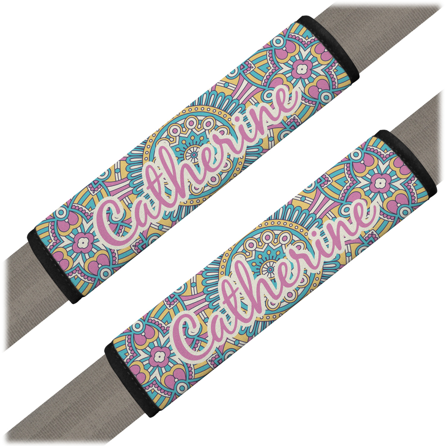 Made from neoprene, our seat belt strap covers wrap around the belt itself and have a Velcro tab for easy attachment and closure. The belt's edges are trimmed with a black polyester for a secure finish. Each cover is 9.5 by 7 inches when open and 9.5 by 2.5 inches when closed. We print your personalized design on the face of the seat belt pad.