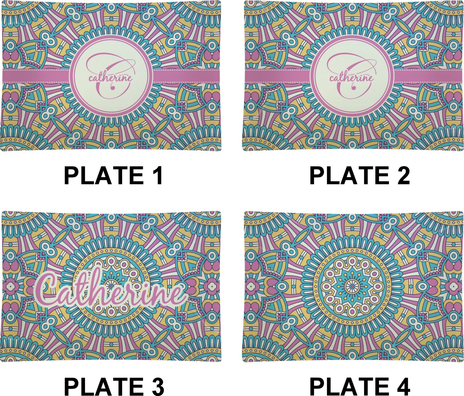The designs main feature is its beautiful pattern. The pattern is filled with intricate detail and bohemian style shapes. The colors are a drastic difference from what you would normally see in a bohemian design, making this design all the more unique. You are able to put your personalization in the frame in the middle. The colors you will find are a bubble gum pink, teal, light yellow, and white.