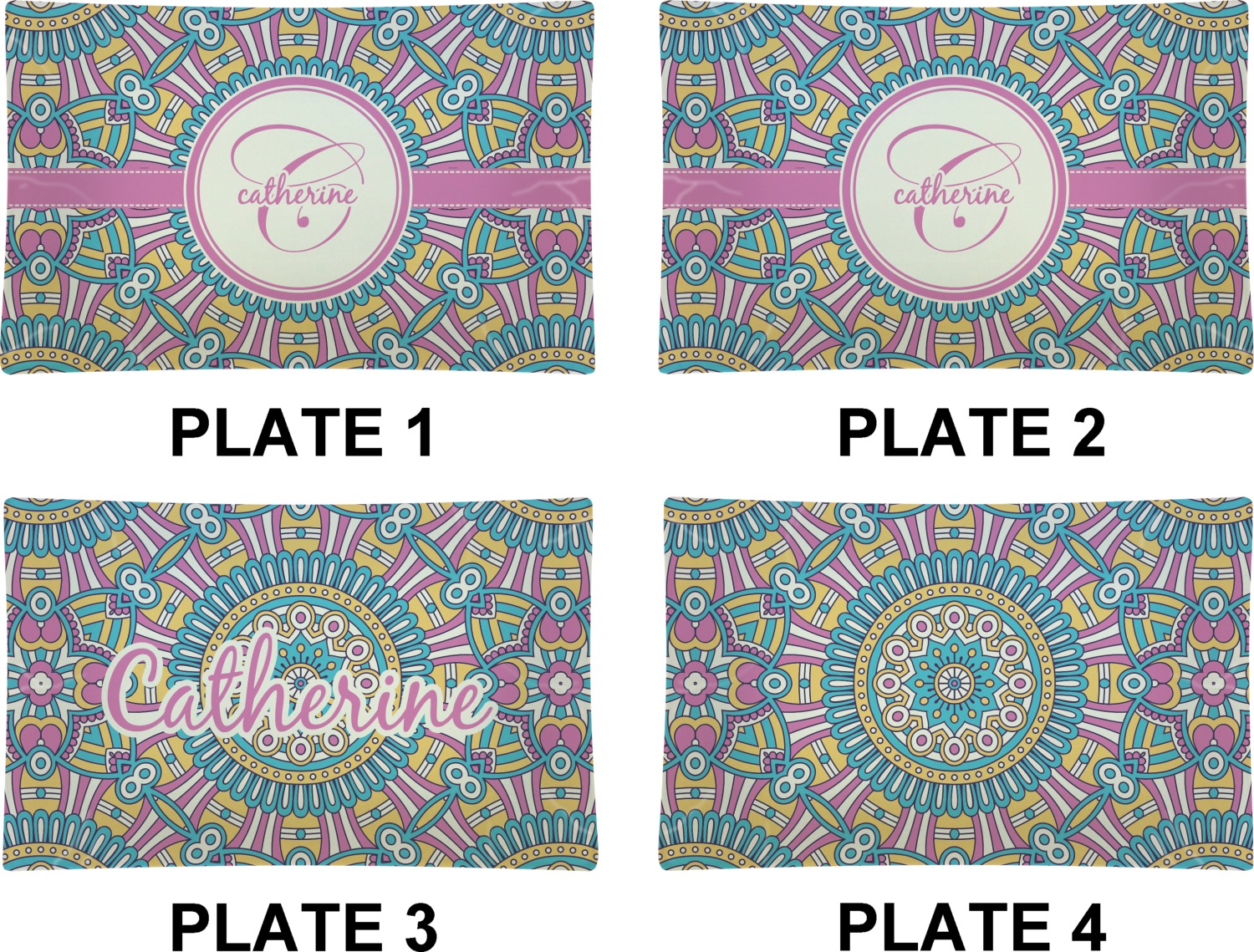 The designs main feature is its beautiful pattern. The pattern is filled with intricate detail and bohemian style shapes. The colors are a drastic difference from what you would normally see in a bohemian design, making this design all the more unique. You are able to put your personalization in the frame in the middle. The colors you will find are a bubble gum pink, teal, light yellow, and white.