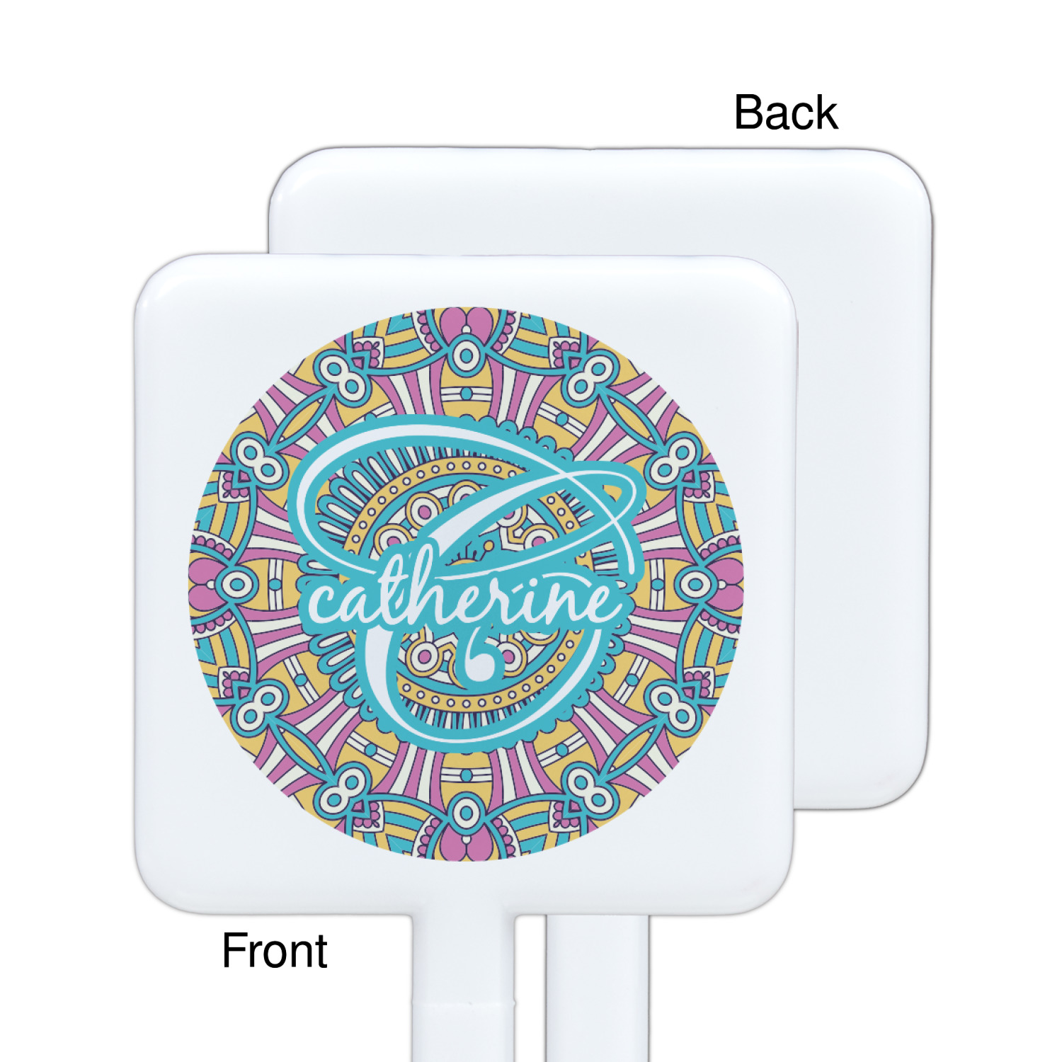 The designs main feature is its beautiful pattern. The pattern is filled with intricate detail and bohemian style shapes. The colors are a drastic difference from what you would normally see in a bohemian design, making this design all the more unique. You are able to put your personalization in the frame in the middle. The colors you will find are a bubble gum pink, teal, light yellow, and white.