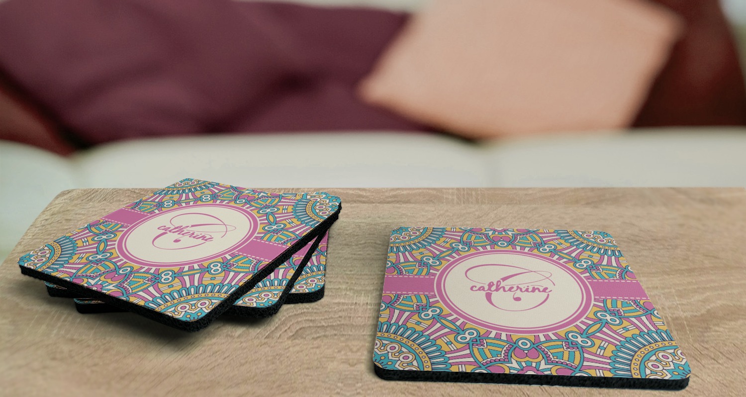 Replace your boring, run-of-the-mill coasters with a set of 4 personalized coasters! When personalized, these coasters will protect your beloved surfaces while adding to your home's decor! Thanks to your coasters bright colors and unique design, your guests will be eager to use them!