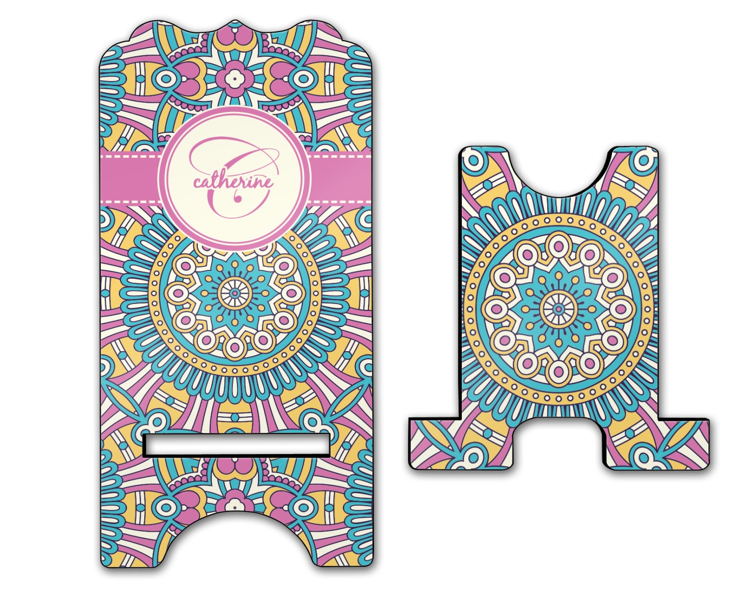 The designs main feature is its beautiful pattern. The pattern is filled with intricate detail and bohemian style shapes. The colors are a drastic difference from what you would normally see in a bohemian design, making this design all the more unique. You are able to put your personalization in the frame in the middle. The colors you will find are a bubble gum pink, teal, light yellow, and white.