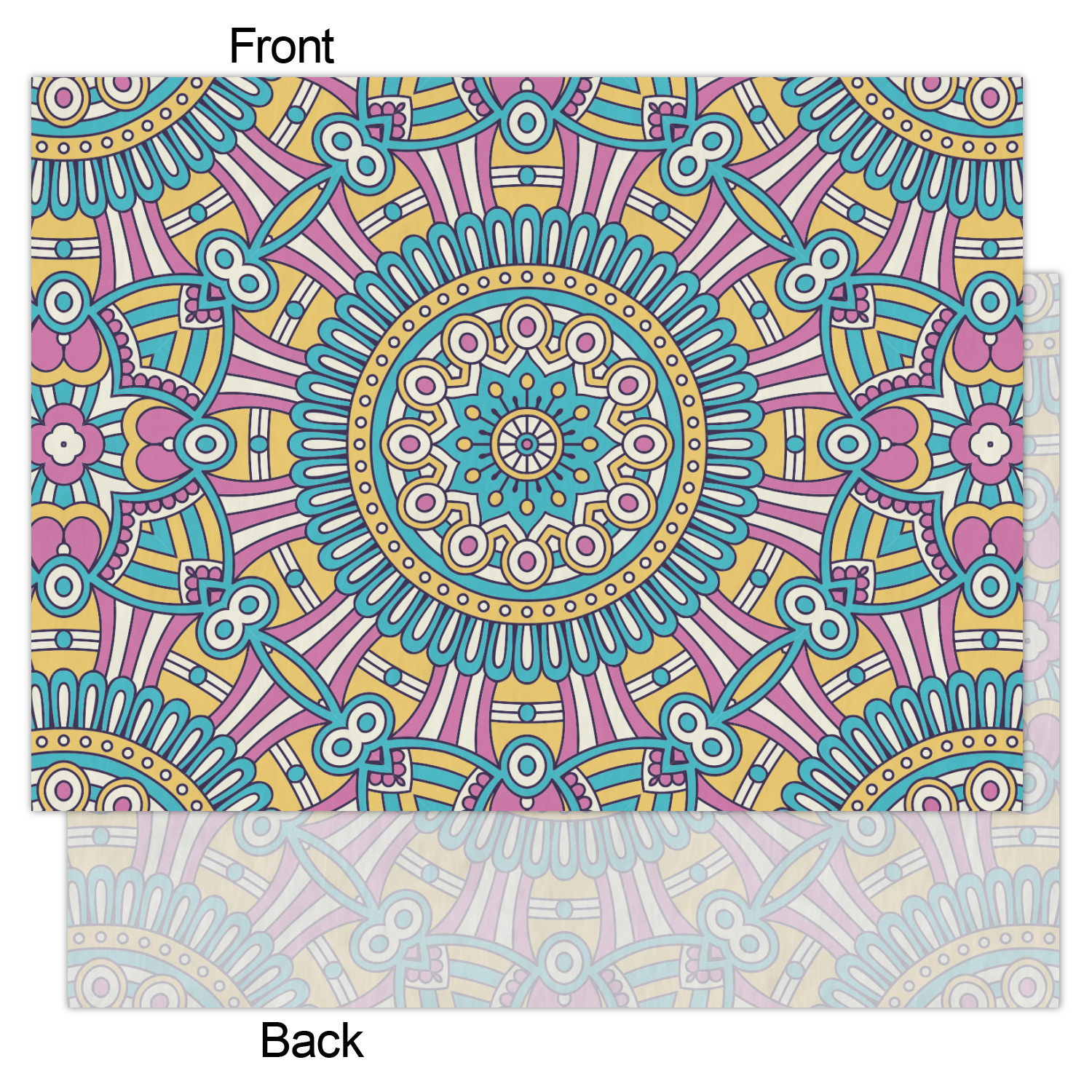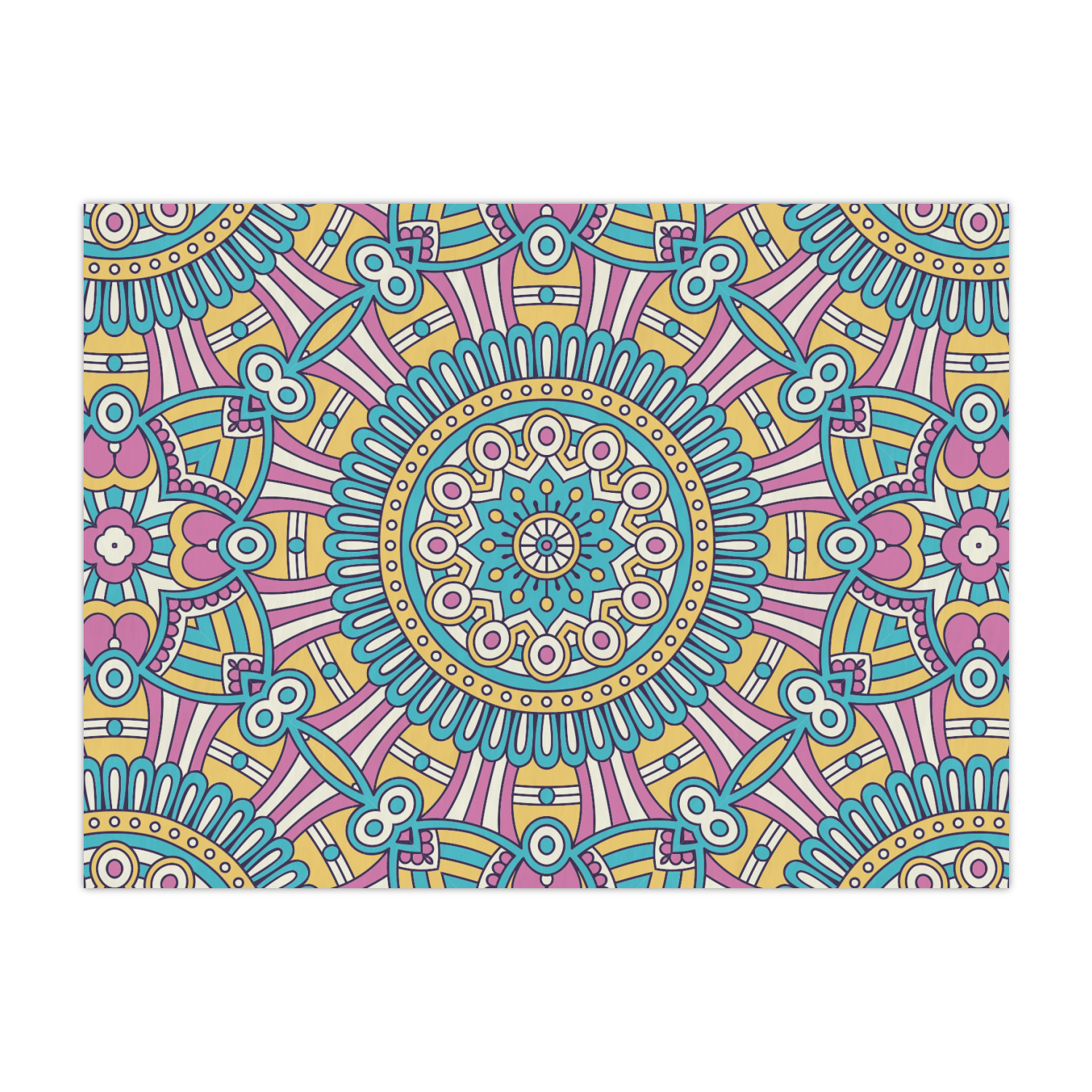 The designs main feature is its beautiful pattern. The pattern is filled with intricate detail and bohemian style shapes. The colors are a drastic difference from what you would normally see in a bohemian design, making this design all the more unique. You are able to put your personalization in the frame in the middle. The colors you will find are a bubble gum pink, teal, light yellow, and white.