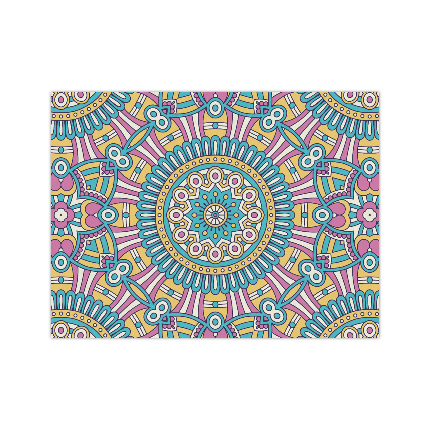 The designs main feature is its beautiful pattern. The pattern is filled with intricate detail and bohemian style shapes. The colors are a drastic difference from what you would normally see in a bohemian design, making this design all the more unique. You are able to put your personalization in the frame in the middle. The colors you will find are a bubble gum pink, teal, light yellow, and white.