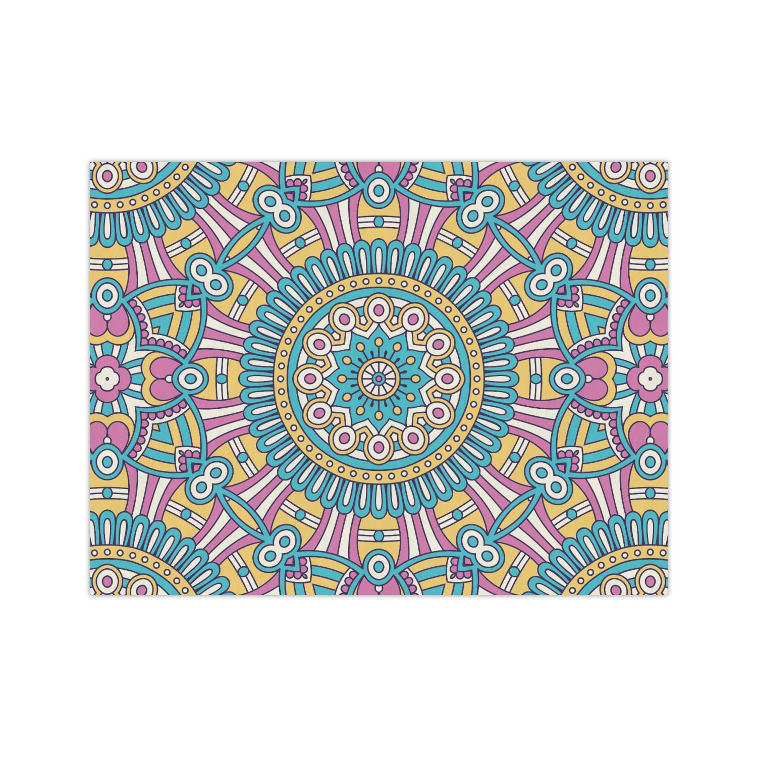 The designs main feature is its beautiful pattern. The pattern is filled with intricate detail and bohemian style shapes. The colors are a drastic difference from what you would normally see in a bohemian design, making this design all the more unique. You are able to put your personalization in the frame in the middle. The colors you will find are a bubble gum pink, teal, light yellow, and white.
