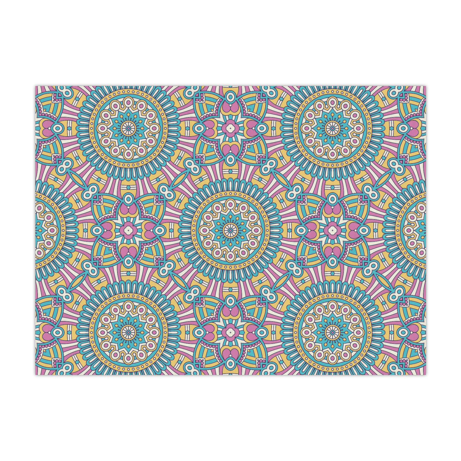 The designs main feature is its beautiful pattern. The pattern is filled with intricate detail and bohemian style shapes. The colors are a drastic difference from what you would normally see in a bohemian design, making this design all the more unique. You are able to put your personalization in the frame in the middle. The colors you will find are a bubble gum pink, teal, light yellow, and white.