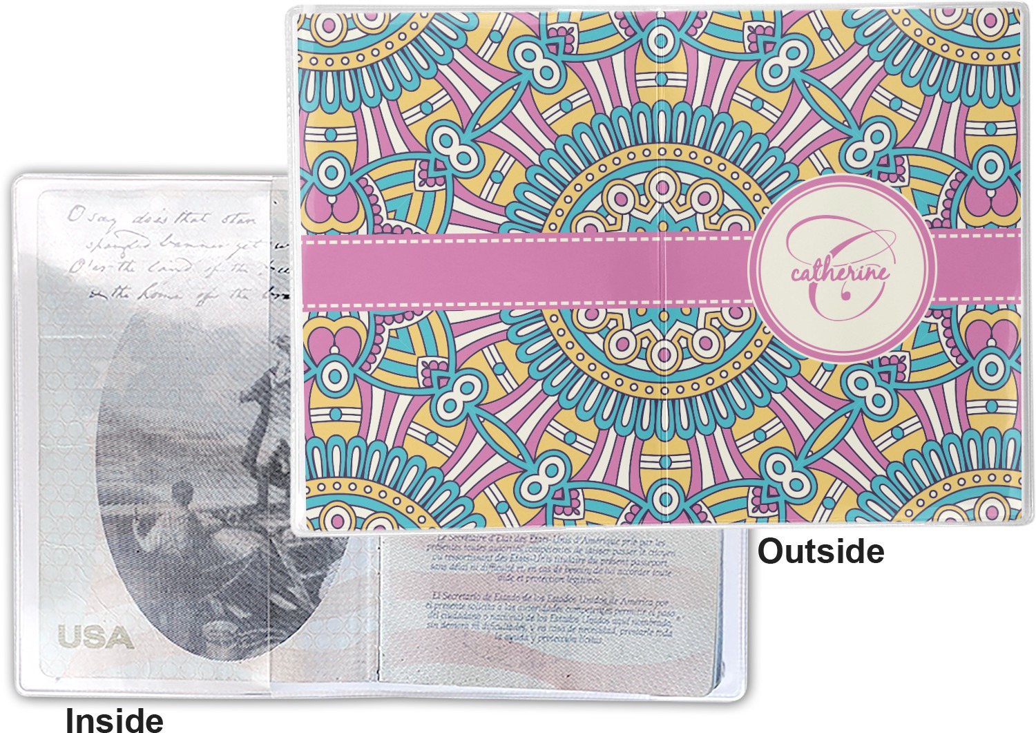 This cover is made of a sturdy clear vinyl with a personalized vinyl insert inside. There is a large and a small pocket on either side to hold the covers of your passport easily and firmly. The passport holder is approximately 7.5" x 5.25", the perfect size to snugly fit your passport. This slim cover is the perfect way to protect your passport without being one more bulky item you have to carry.