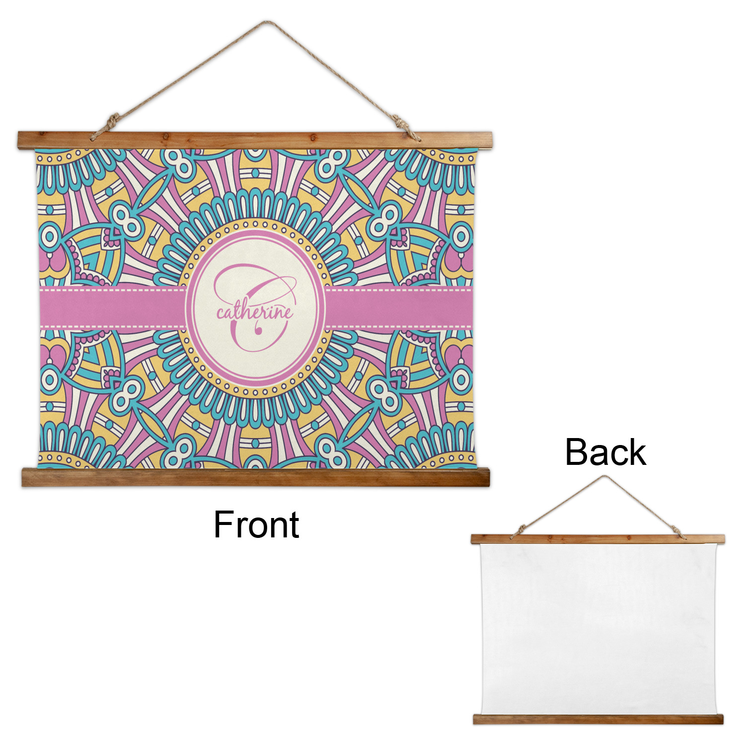 The designs main feature is its beautiful pattern. The pattern is filled with intricate detail and bohemian style shapes. The colors are a drastic difference from what you would normally see in a bohemian design, making this design all the more unique. You are able to put your personalization in the frame in the middle. The colors you will find are a bubble gum pink, teal, light yellow, and white.
