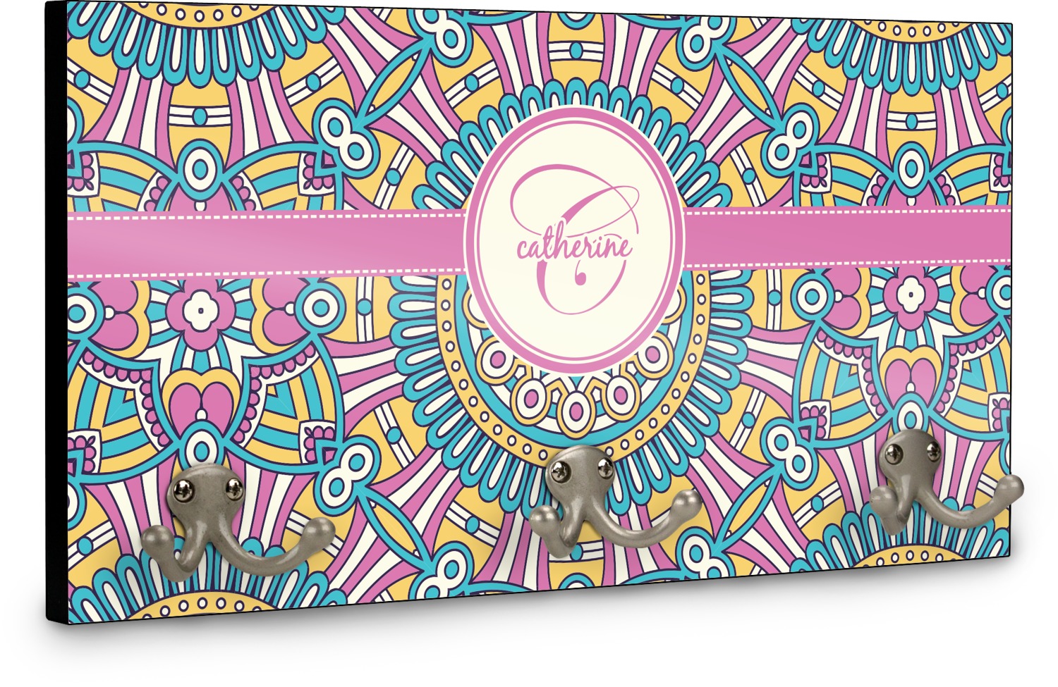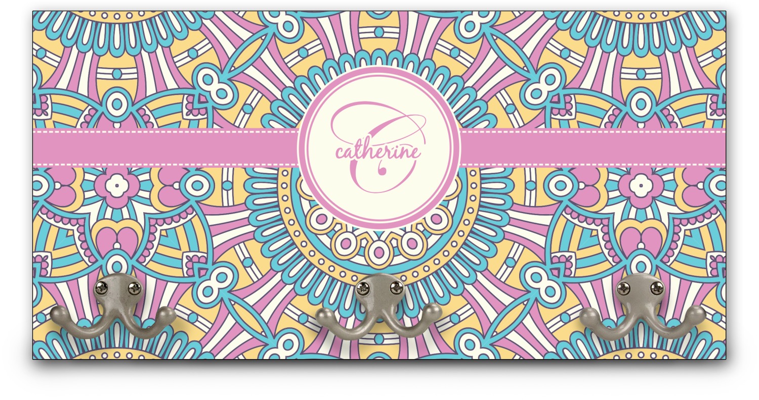 The designs main feature is its beautiful pattern. The pattern is filled with intricate detail and bohemian style shapes. The colors are a drastic difference from what you would normally see in a bohemian design, making this design all the more unique. You are able to put your personalization in the frame in the middle. The colors you will find are a bubble gum pink, teal, light yellow, and white.